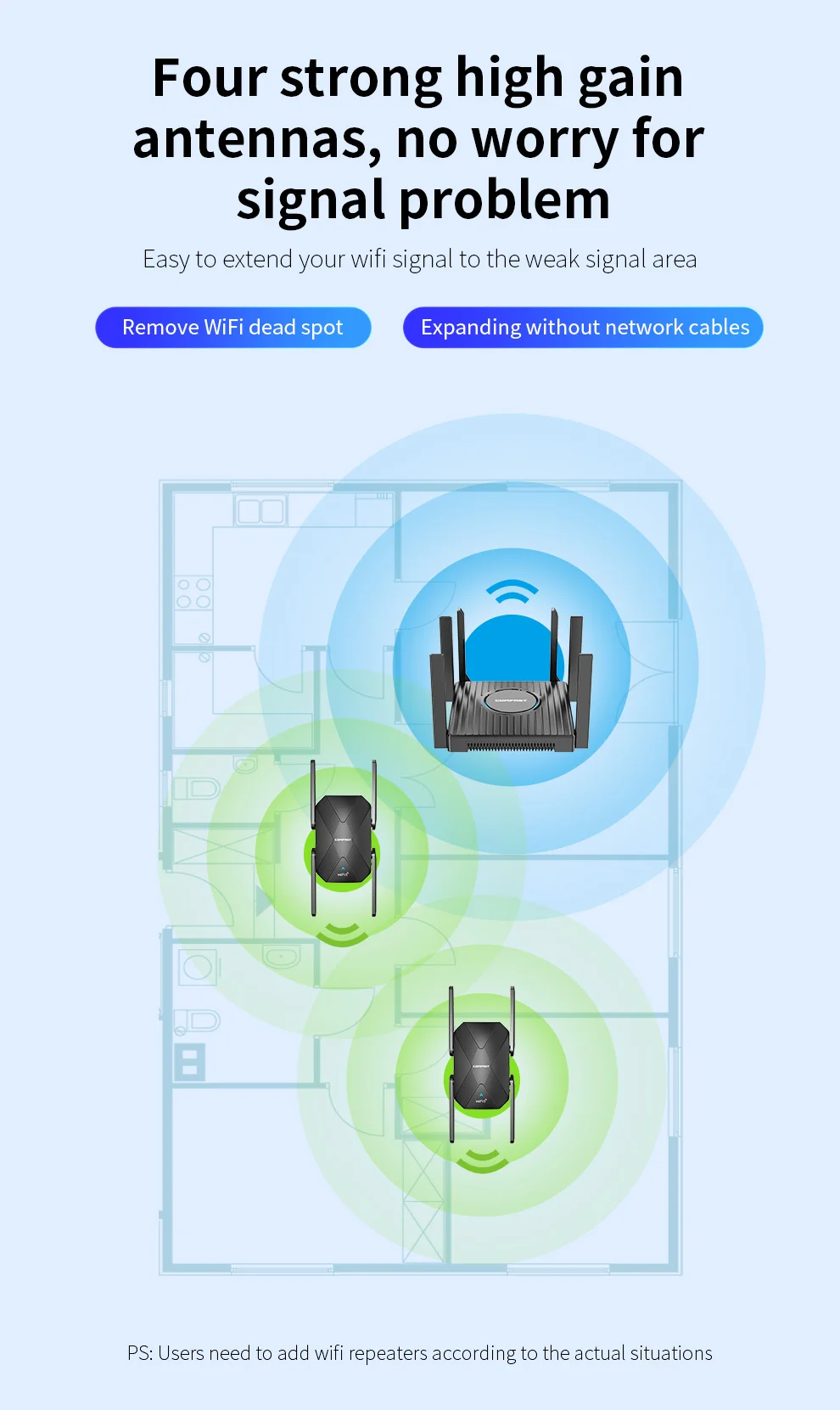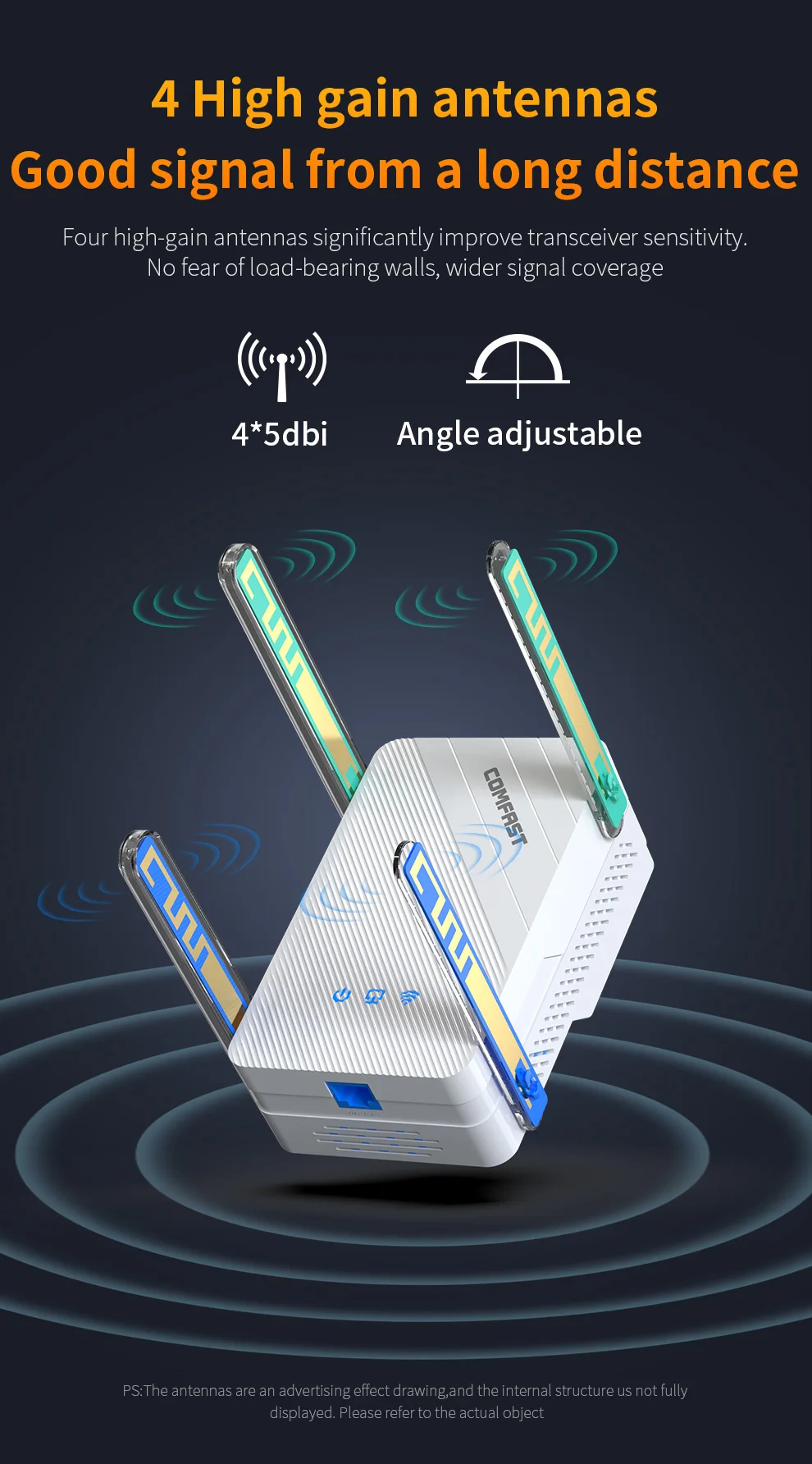 5. Las cuatro antenas de alta ganancia amplian la cobertura de la señal y proporcionan una fuerte penetración a través de las paredes.