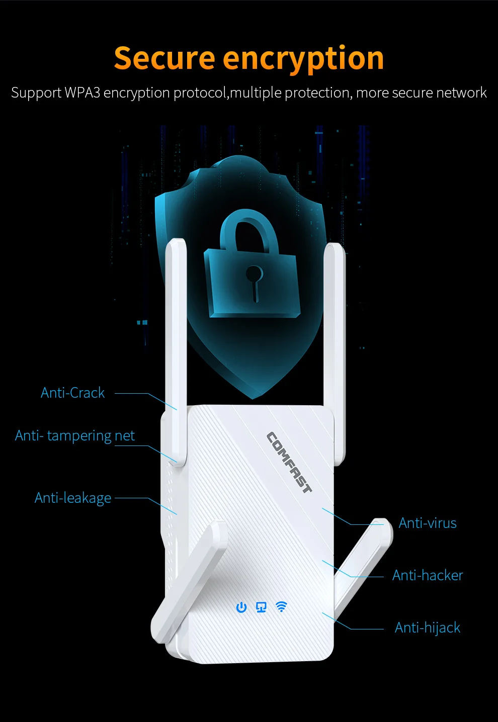 5.Alta gananciaAntenas 4*3dBiDiseño, la transmisión y recepción de la señal es más fuerte a través de la pared.