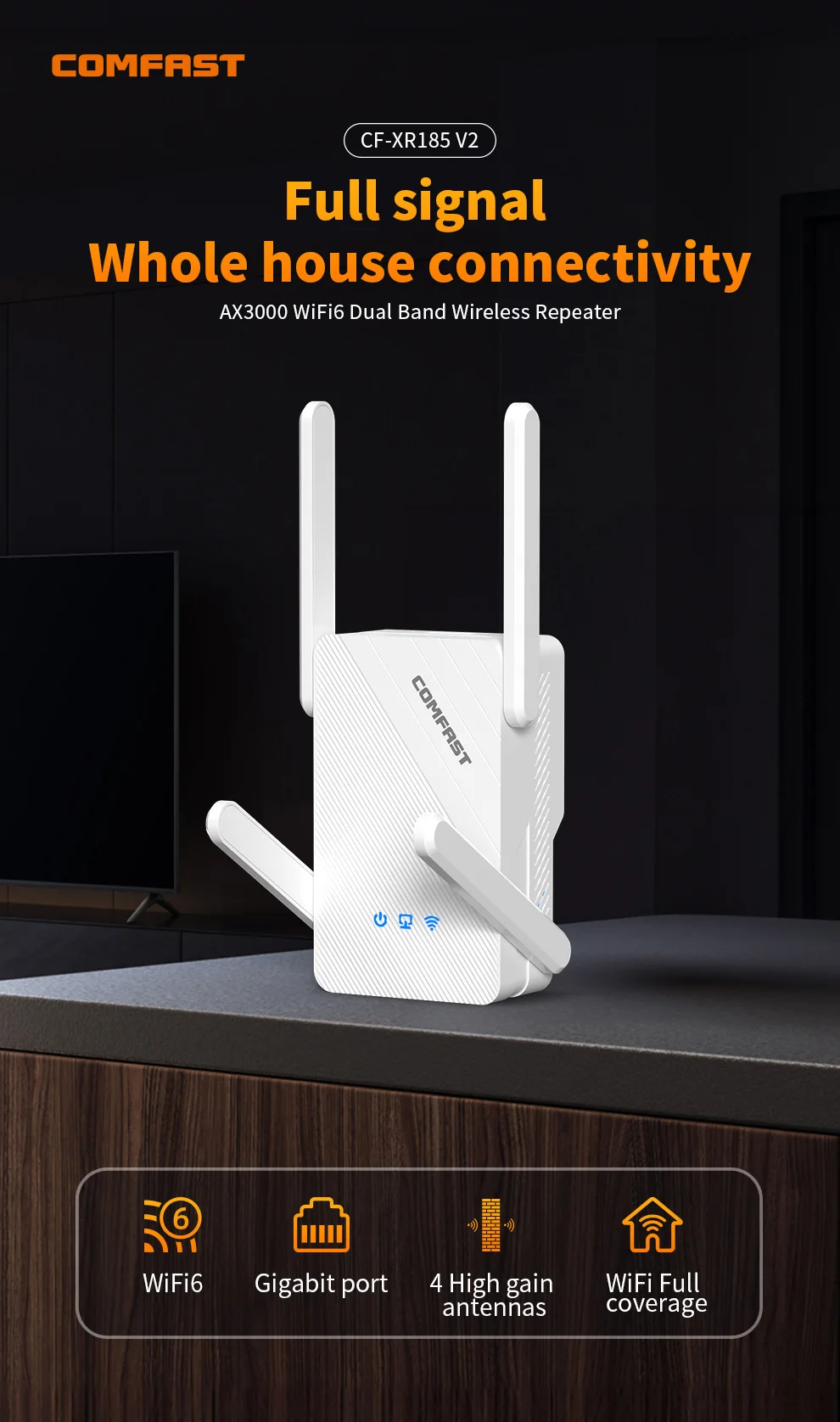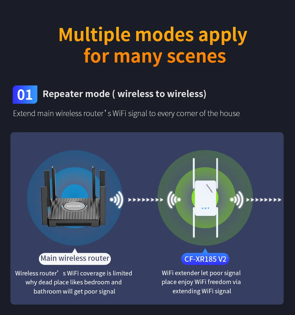 CF-XR181 es un amplificador de señal WiFi6 de alta potencia de 1500 Mbps.Está equipado con 4 antenas de alta ganancia para mejorar la señal.Se puede utilizar con enrutadores WiFi6 para eliminar los puntos muertos de las señales WiFi en el hogar y resolver problemas como un gran alcance de varios dormitorios y una cobertura de enrutamiento incompleta de casas grandes.Es eficaz ampliar la cobertura WiFi para lograr una cobertura WiFi real para toda la casa.