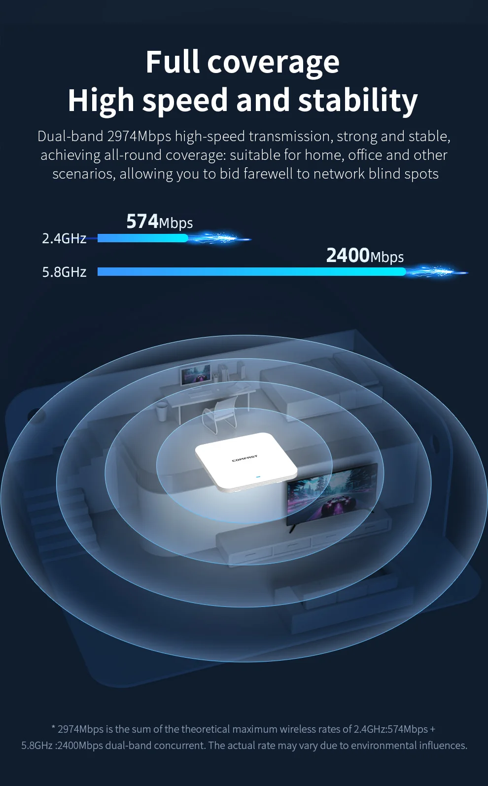 CF-E391AX adopta el estándar WiFi6 de nueva generación, admite velocidad inalámbrica de doble banda de 2974 Mbps, 2.4GHz y 5.Moneda de doble banda de 8 GHz, optimización automática y selecciona la banda de frecuencia con mayor velocidad de red y menos interferencias para que los usuarios accedan a Internet;Proporcione a los usuarios redes inalámbricas para interiores rápidas, completas y estables.