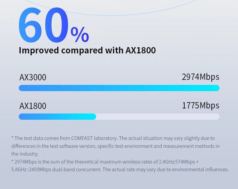 • Admite estándares de protocolo 802.11a/b/g/n/ac/ax; banda dual de 2,4 GHz y 5,8 GHz, más agradable; velocidad de transmisión inalámbrica de alta velocidad de doble frecuencia de 2974 Mbps;