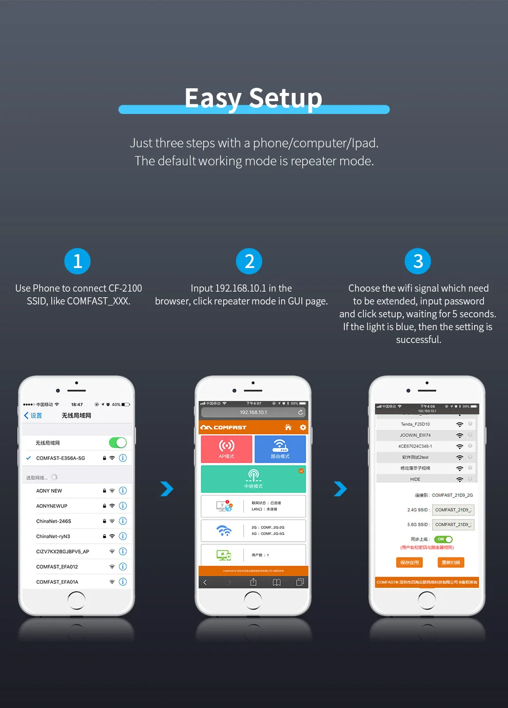 Just three steps with a phone/computer/lpad. The default working mode is repeater mode.