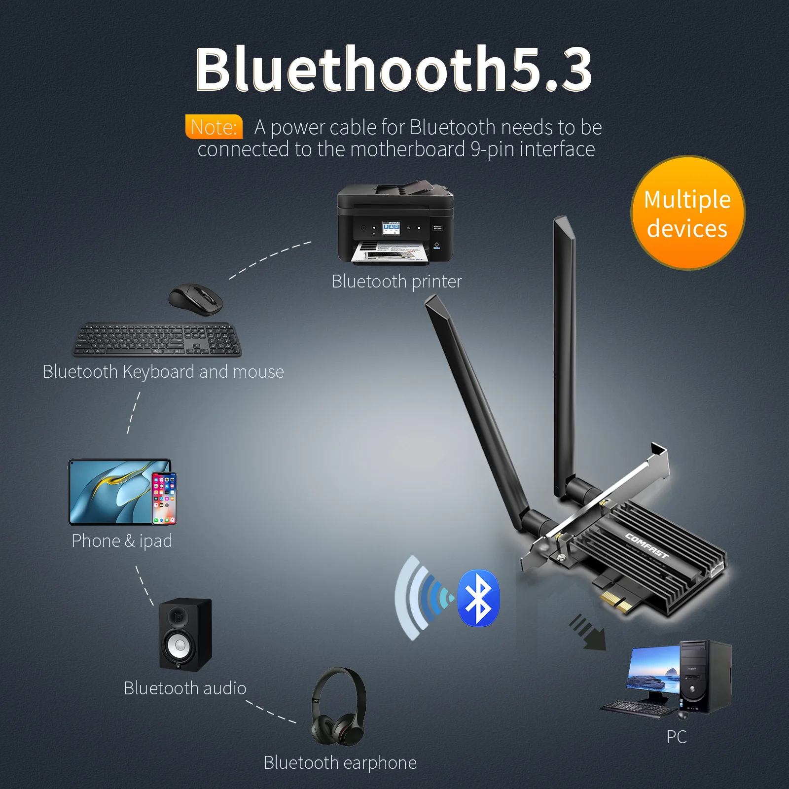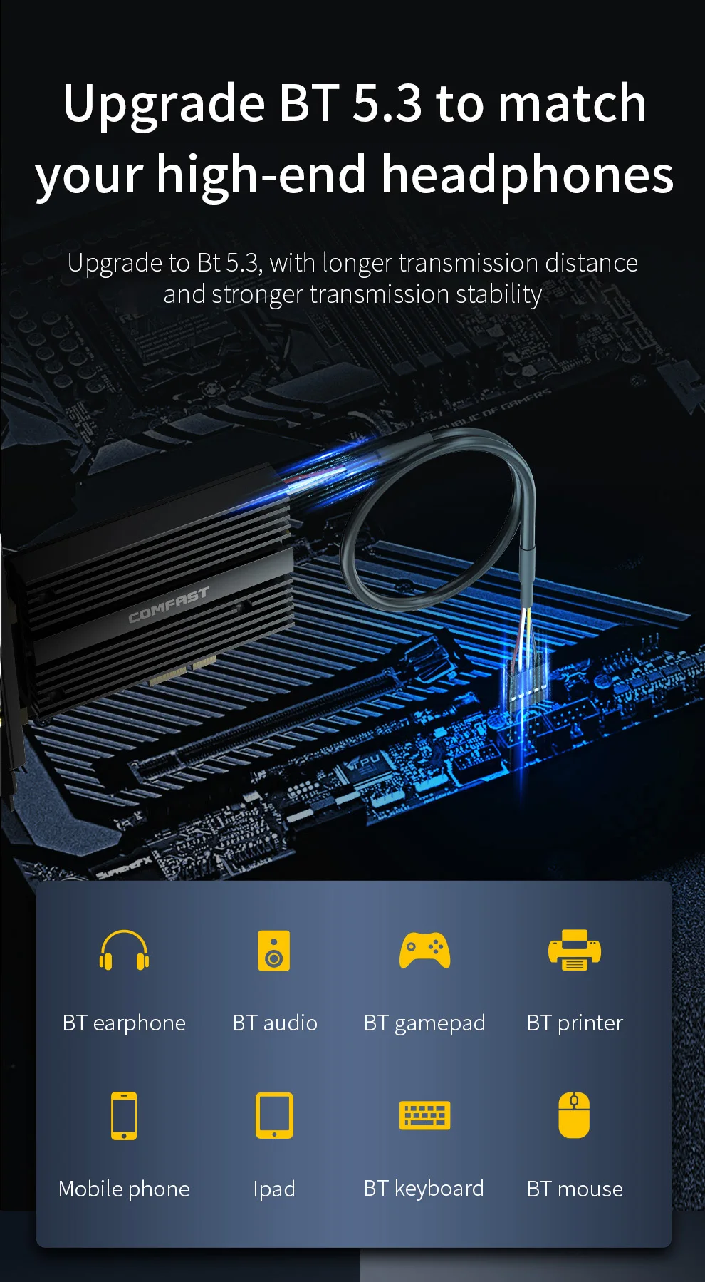 Actualice a BT 5,2, con mayor distancia de transmisión y mayor estabilidad de transmisión. Admite auriculares Bluetooth, audio Bluetooth, GamePad Bluetooth, impresora Bluetooth, teléfono móvil, LPAD, teclado Bluetooth, ratón Bluetooth, etc.