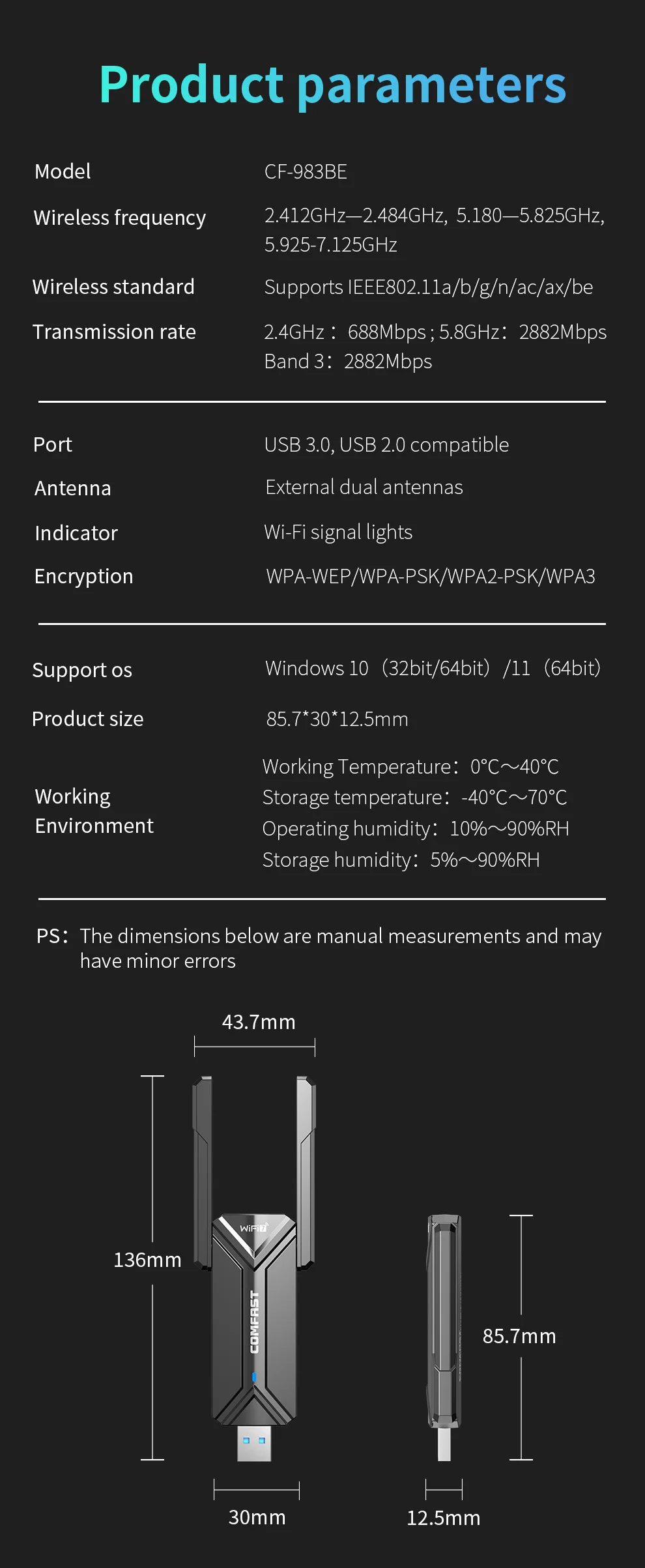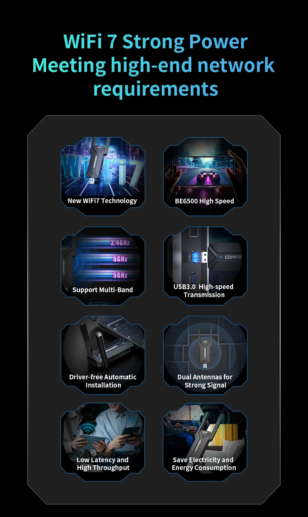 La última tecnología WiFi de séptima generación, producto insignia de la marca COMFAST, le permite equipar completamente la tarjeta de red de su computadora portátil/de escritorio.