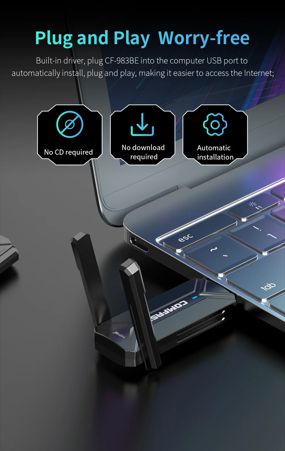 Controlador incorporado, conecte CF-983BE al puerto USB de la computadora para instalarlo, conectarlo y usar automáticamente, lo que facilita el acceso a Internet