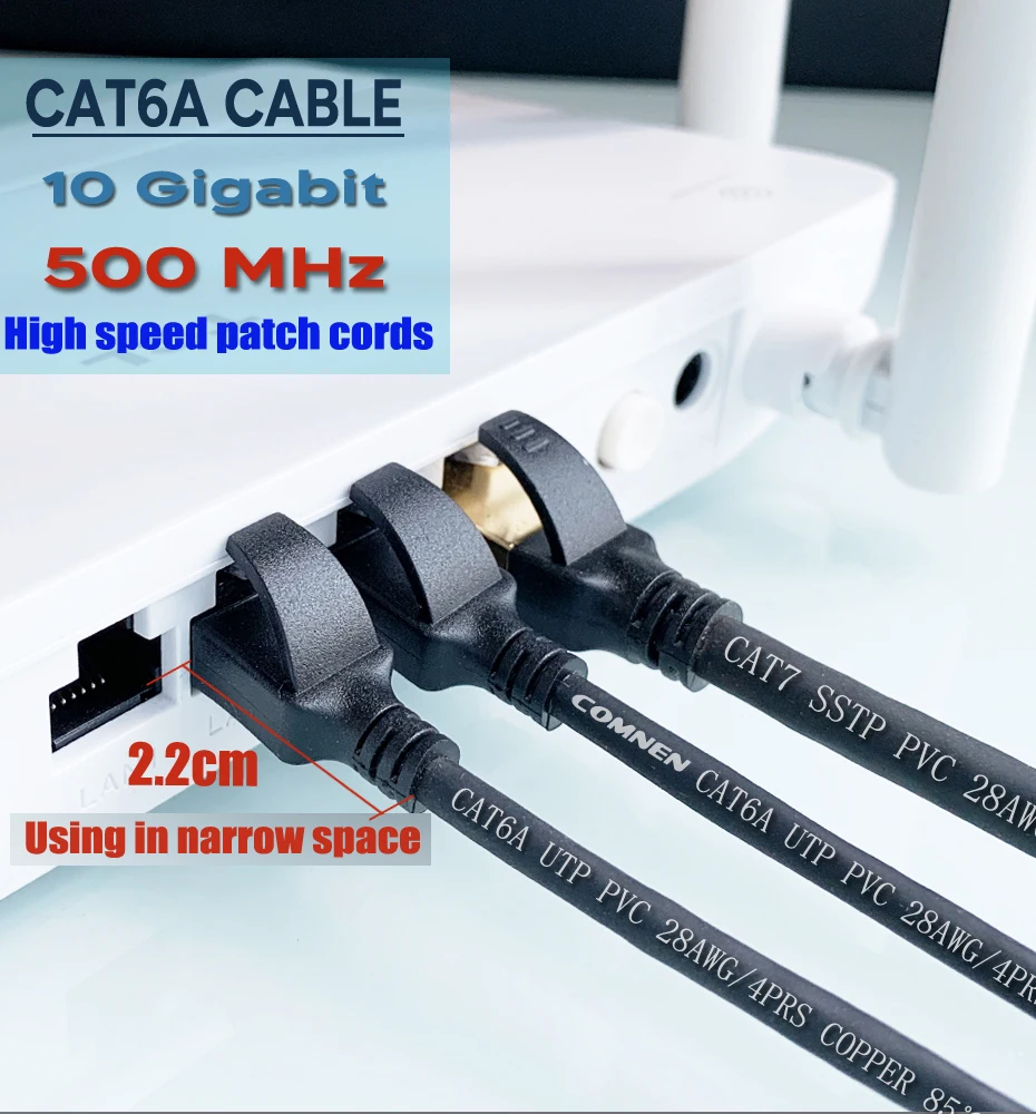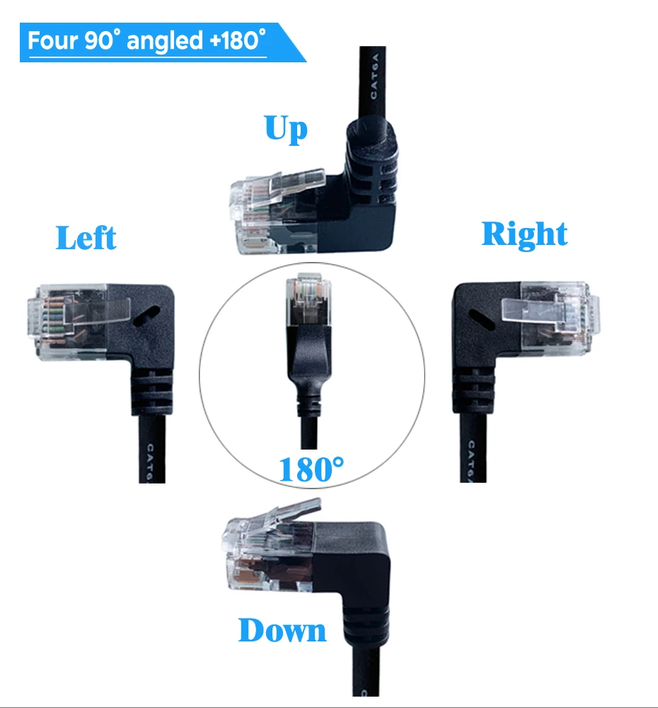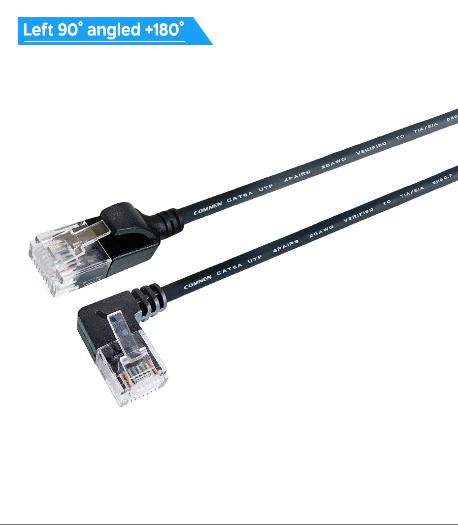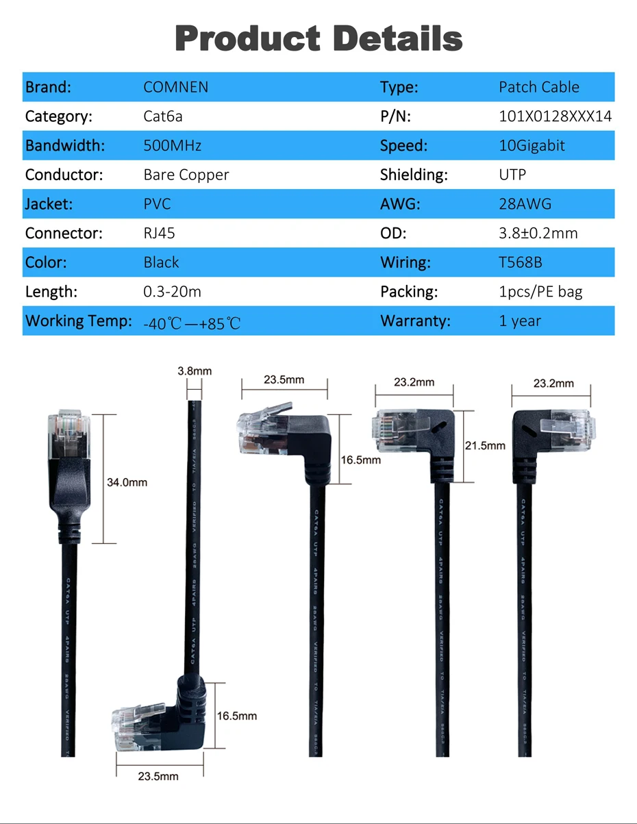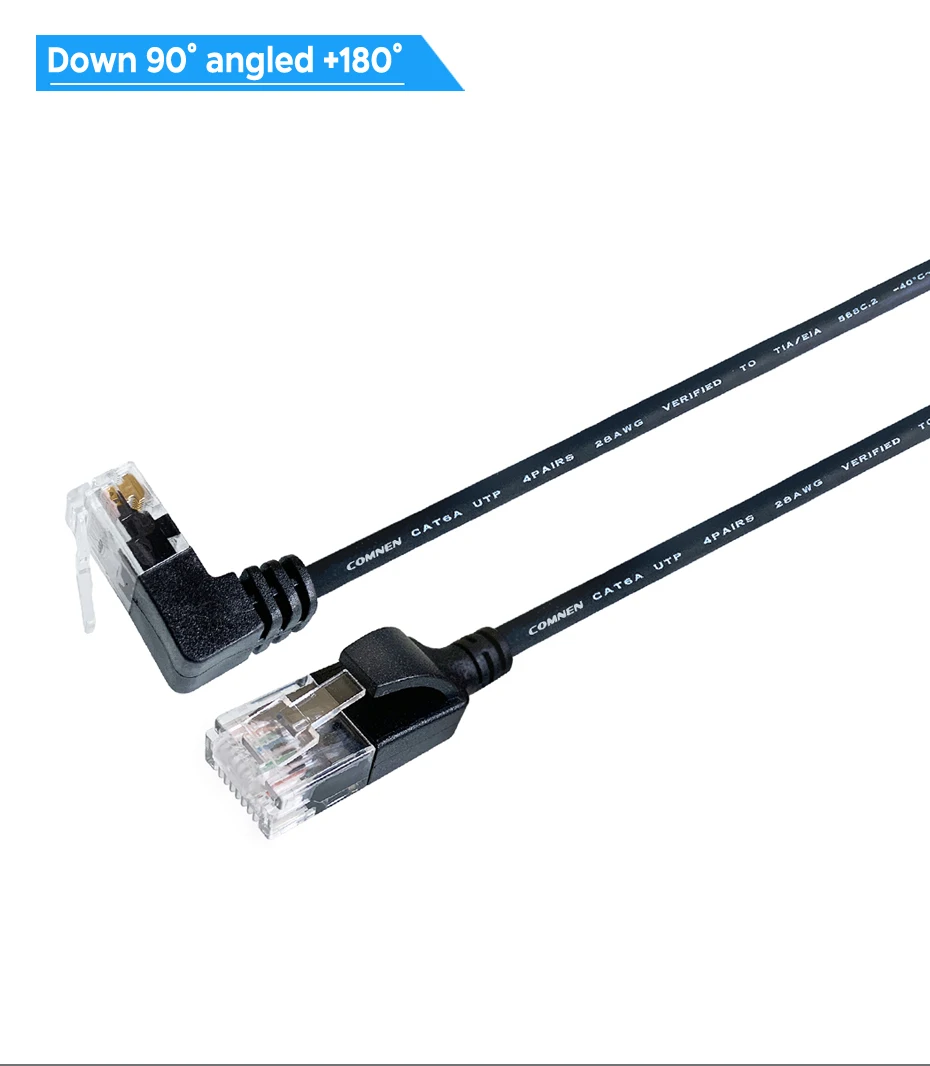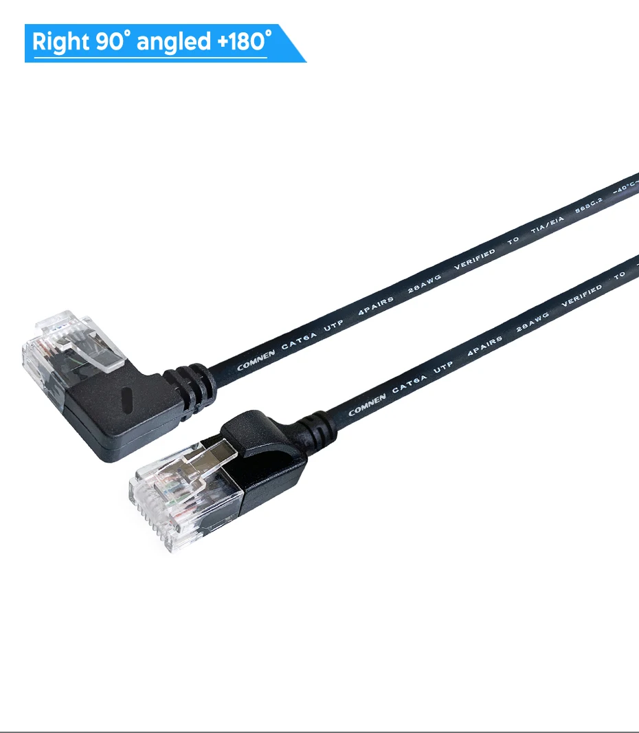 COMNEN's Cat6a UTP 90 degree angled Ultra Thin Patch Cable features category 6a high performance(10Gbps | 1-500MHz), but in a very small diameter patch cords, which is 3.8mm; Four 90 degree angles for your choosing. Extremely flexible modified PVC jacket allows working temp from -40 to +85 degree. Consists of unshielded 8p8c RJ45 male connector on each end and 4 twisted unshielded pairs 28AWG(7/0.12mm) bare copper wires. Typically used for 10 Gigabit Ethernet or backward cat6, cat5e and cat5 network connections such as patch panels, switches, computers and routers. All cables are 100% tested before packing.