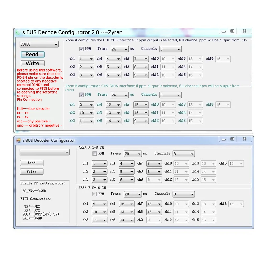 Decodificador SBUS a pwm/ppm, salida completa de 16 canales, admite la configuración final de la computadora, cualquier puerto de salida de cualquier dato de canal, puede ser salida multipuerto 1 o múltiples señales, todos los canales de salida personalizados, admite conversión futaba, naranja, frsky y otras señales sbus.Por ejemplo, el receptor FRSKY X8R tiene solo 8 interfaces PWM, pero este receptor puede generar 16 canales usando puertos SBUS, pero si se utilizan 16 canales PWM, el receptor de doble frecuencia puede funcionar conjuntamente, pero se utiliza el decodificador sbus a pwm..Solo se requiere un receptor y convertidor para lograr las salidas de 16 canales pwm.