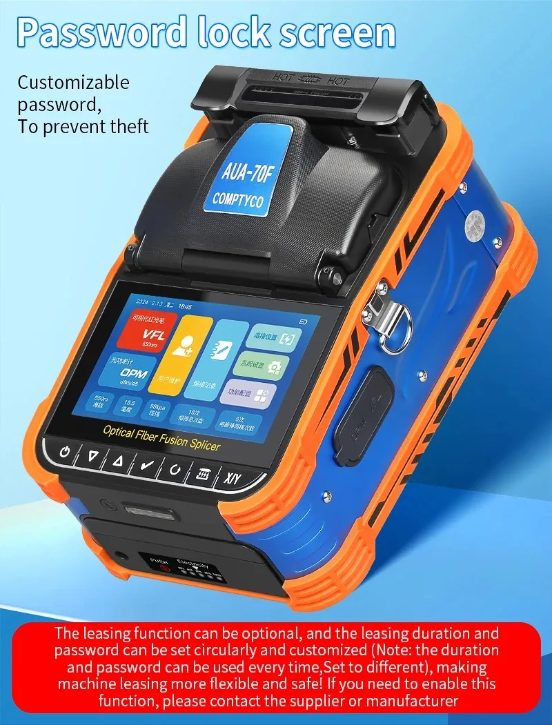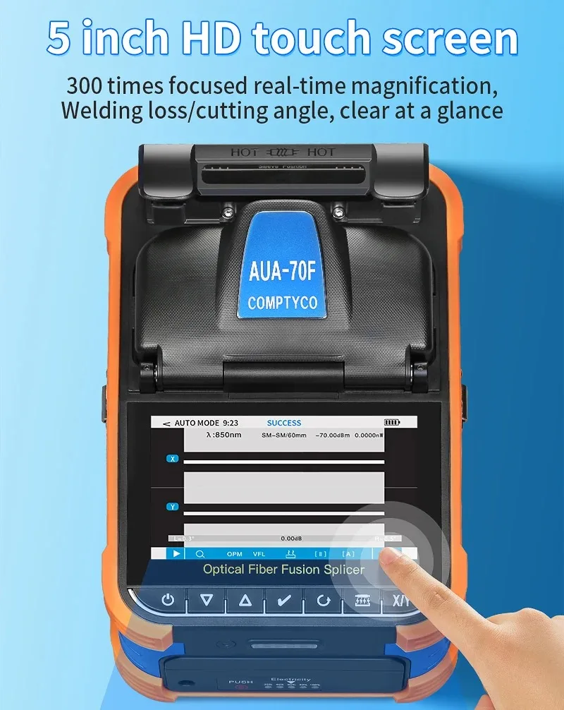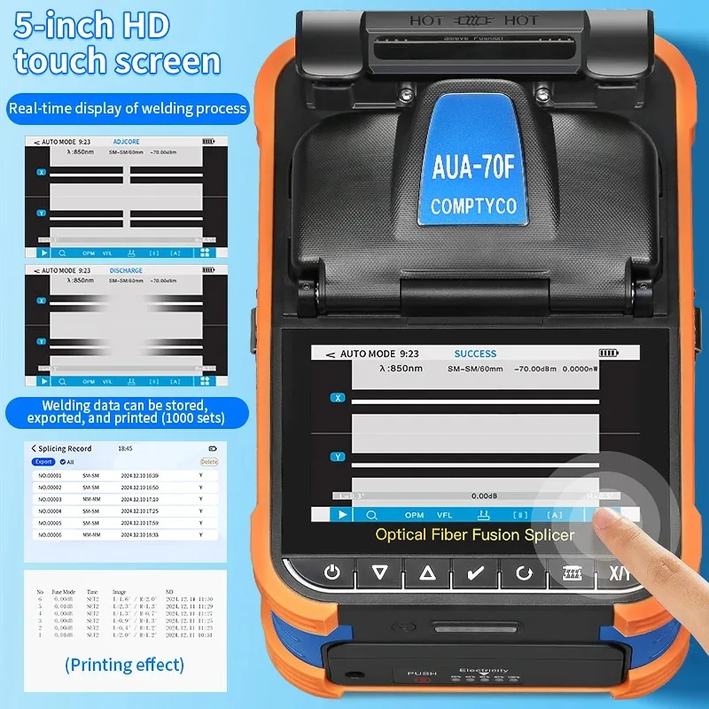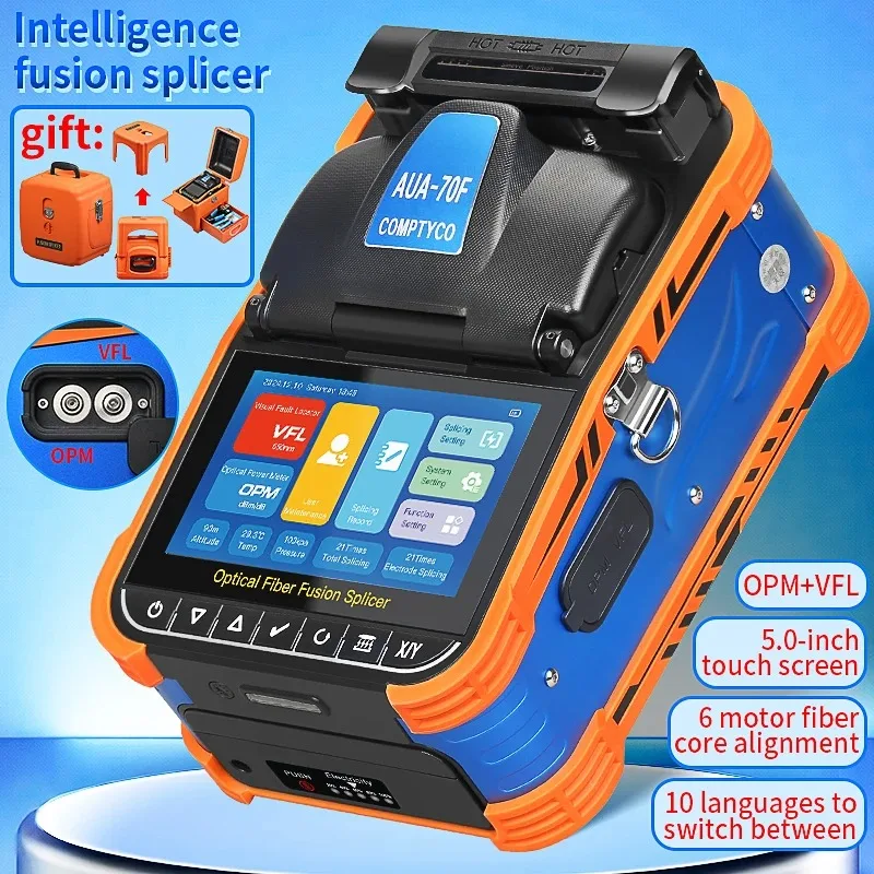 COMPTYCO AUA-70F empalmador de fusión de fibra óptica seis motores multilingüe SM/MM máquina de soldadura de núcleo de fibra función VFL OPM incorporada