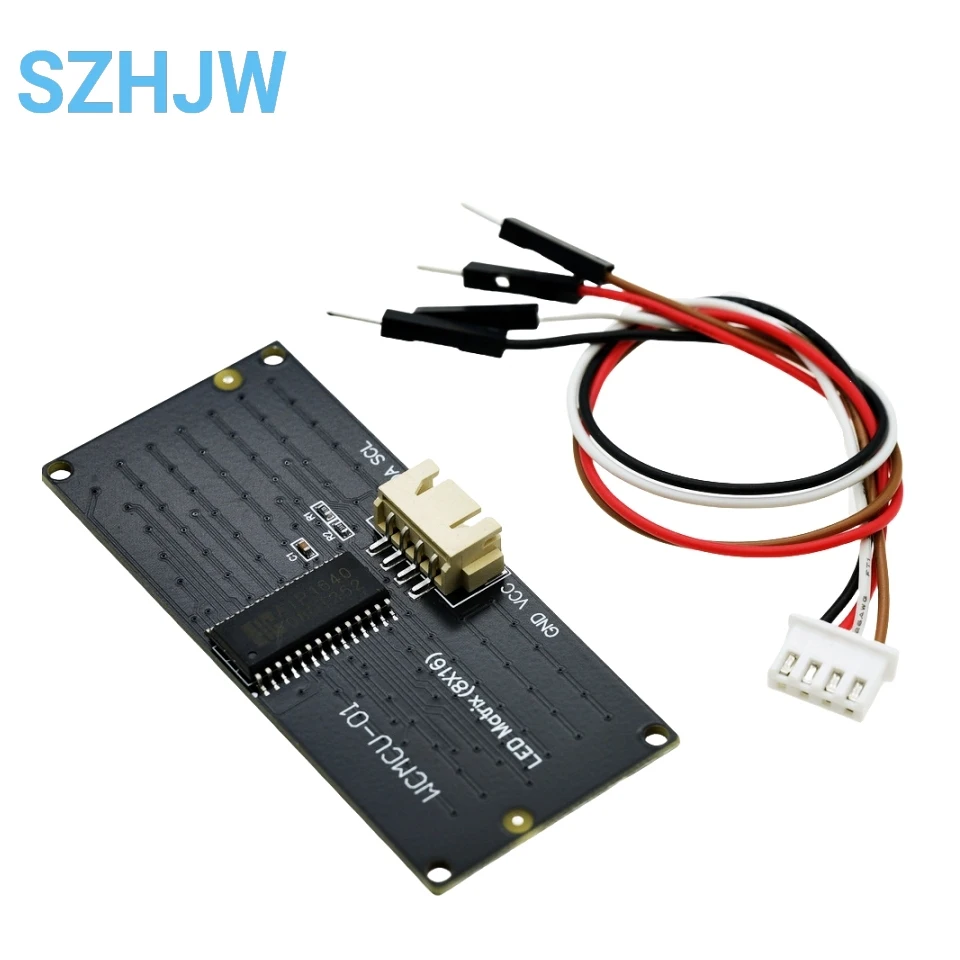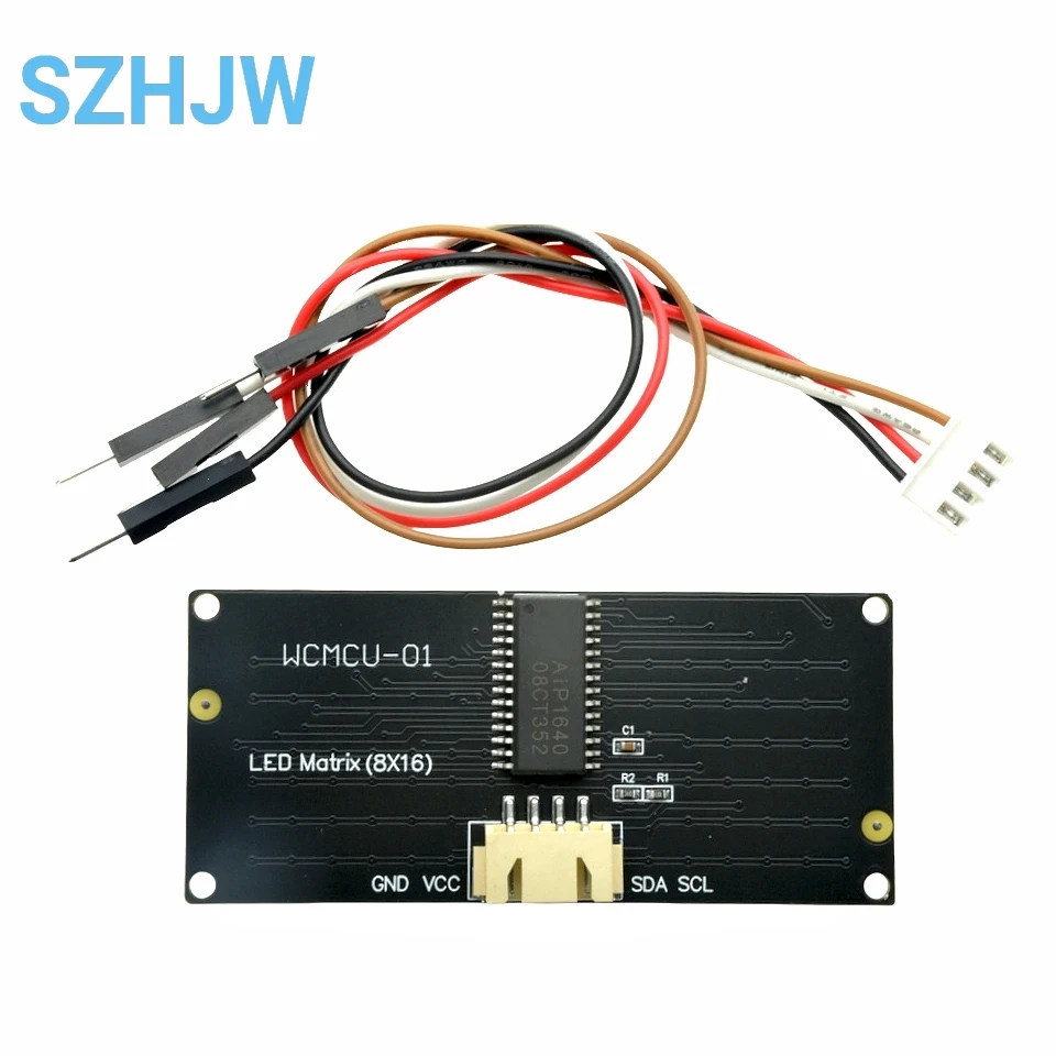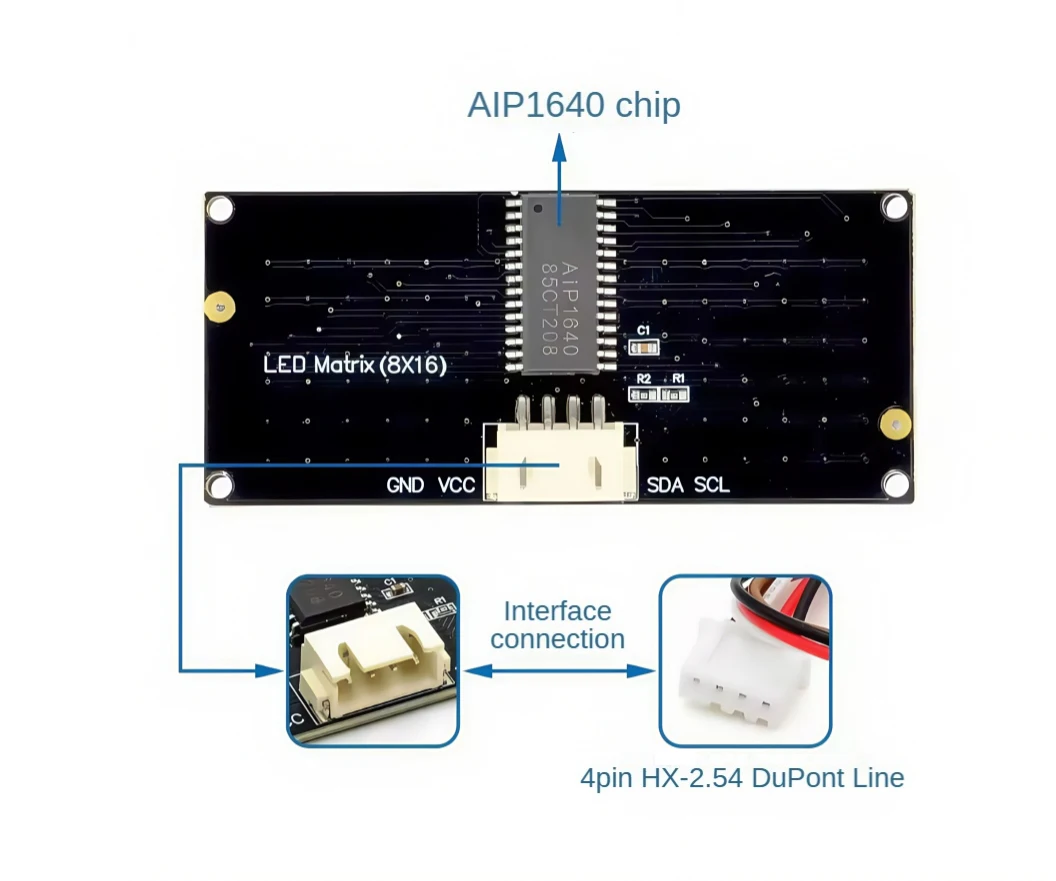 El tablero de luz LED 8x16 viene con 128 LED y está equipado con un chip AIP1640.Podemos realizar la comunicación I2C entre el microordenador de un solo chip y este módulo.Al controlar el chip AIP1640, podemos controlar el encendido y apagado de 128 LED en el módulo, permitiendo así que la matriz de puntos en el módulo muestre los patrones que necesita.Para facilitar el cableado, también entregamos un HX-2,54Cableado de 4 pines.