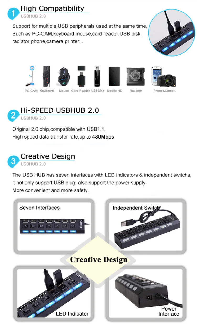 Concentrador USB 2,0 de 7 puertos, divisor USB de 30/3 y, interruptor de adaptador de corriente CA CC de 5V 2A, luz LDE para PC, ordenador portátil, Macbook Pro, Xiaomi, Lenovo, OTG