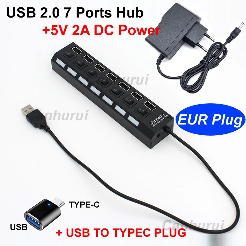 Comprar Concentrador de puertos USB 2,0, divisor USB de 50cm, 7 puertos, TYPE-C, 30/3.1, 5V, 2A, adaptador de corriente CA y CC, interruptor de luz led para PC, ordenador portátil y Notebook
