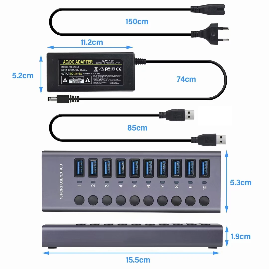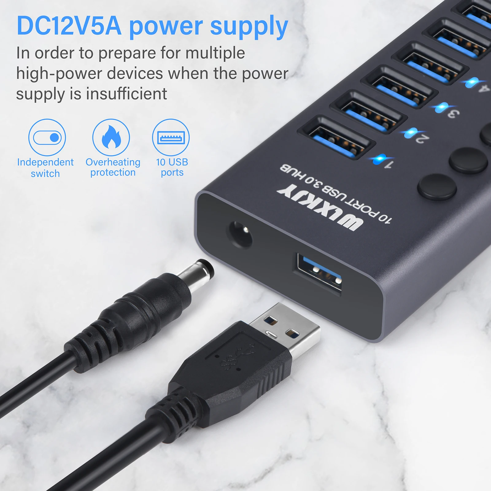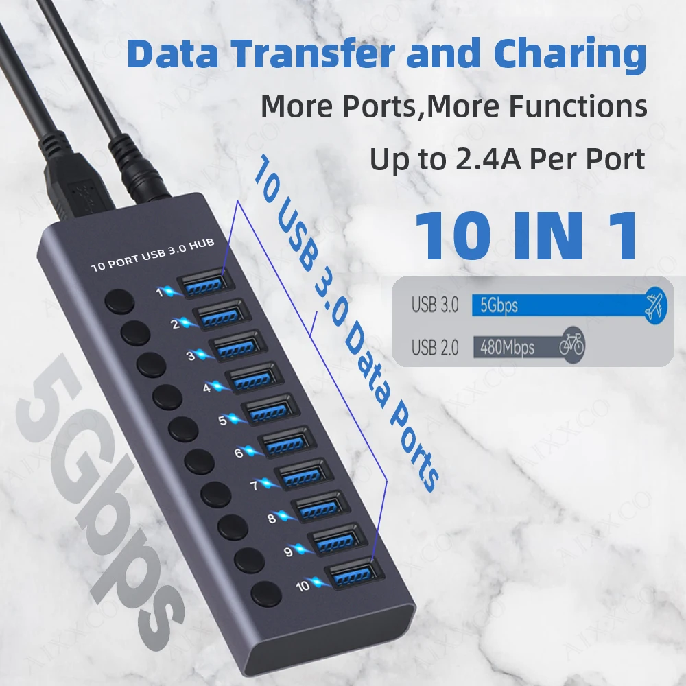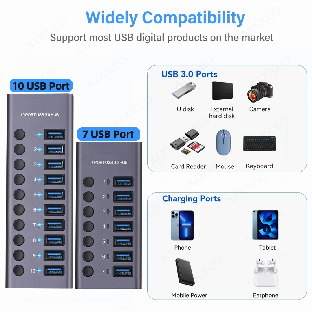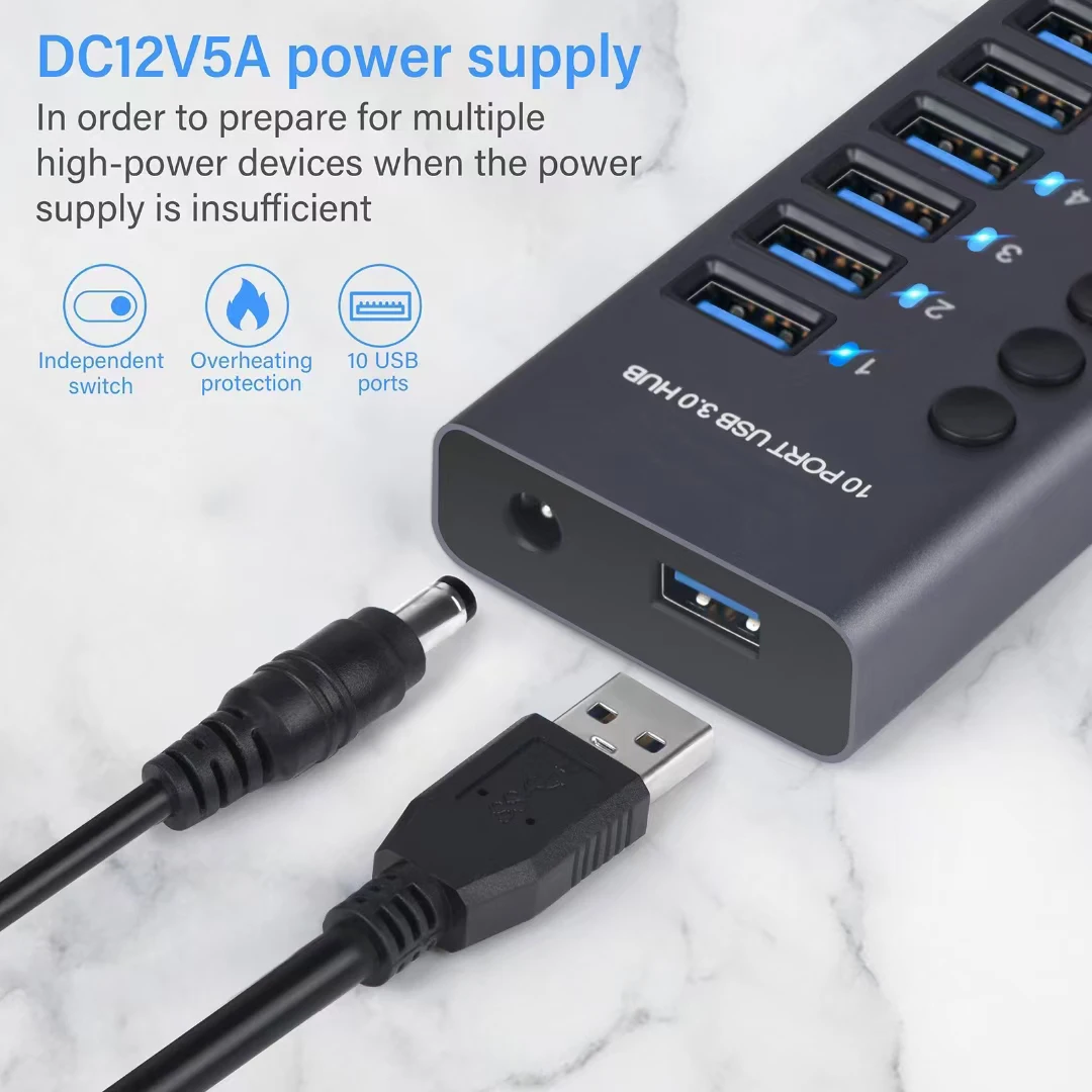 Comprar Concentrador de puertos USB 7/10, divisor Multi USB con interruptor, adaptador de corriente, expansor múltiple para accesorios de ordenador portátil, divisor MacBook, 3,0
