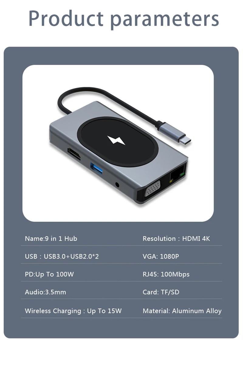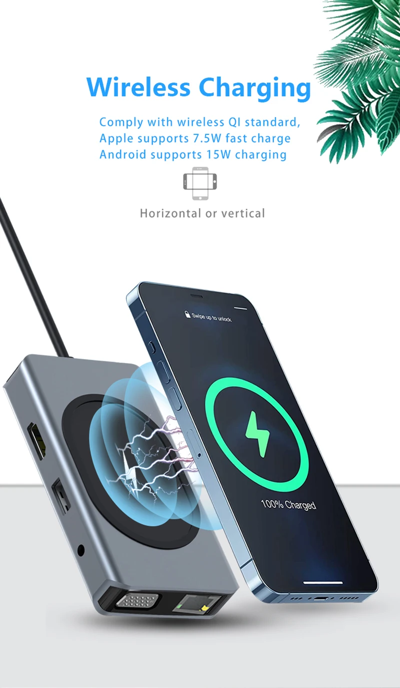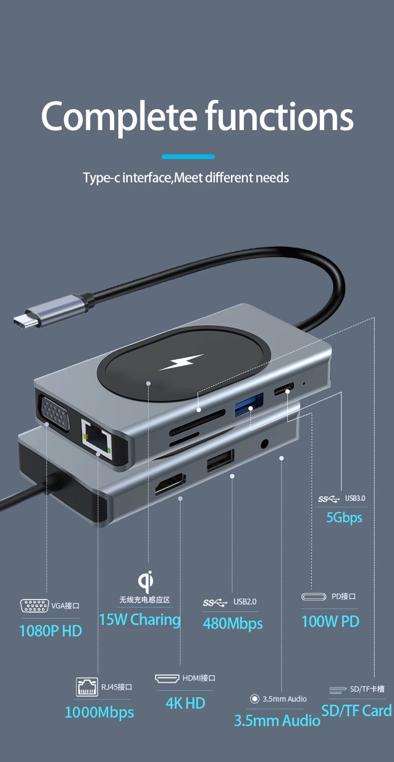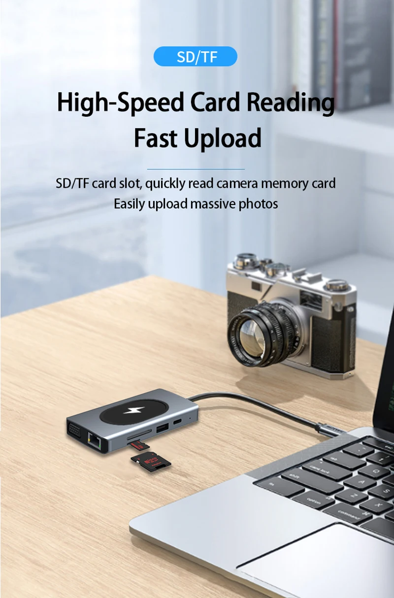 Tipo C A + VGA + USB * 2 + RJ45 + SD + TF + 3,5 AUDIO + PD + cargador inalámbrico de 15W