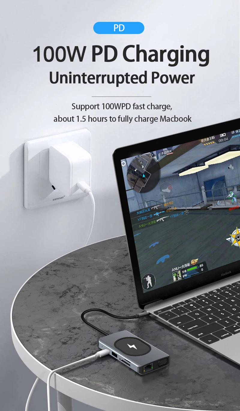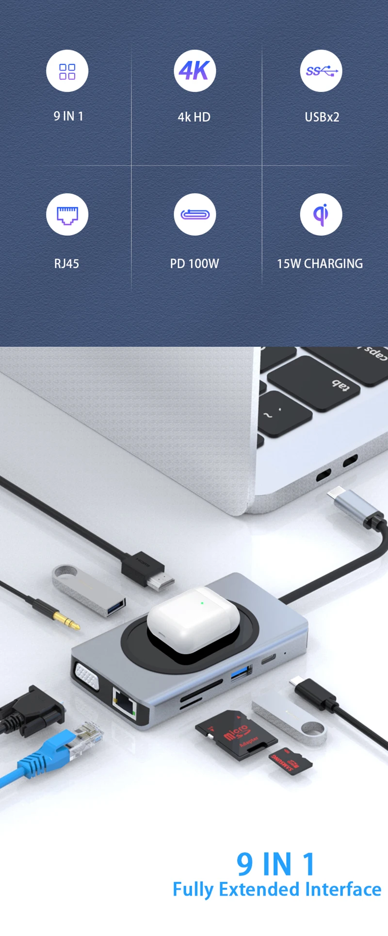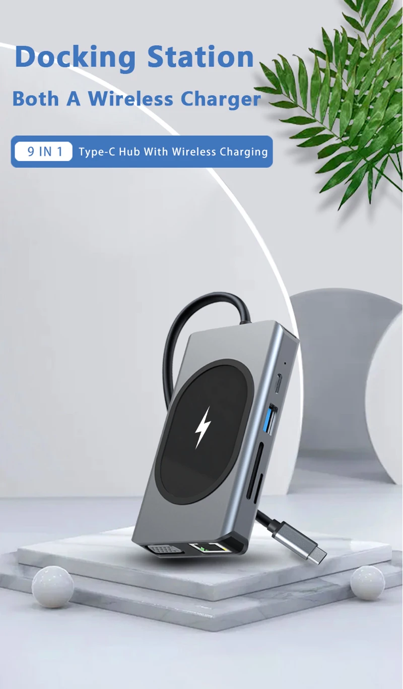 Tipo C A + VGA + USB * 2 + RJ45 + SD + TF + 3,5 AUDIO + PD + cargador inalámbrico de 15W
