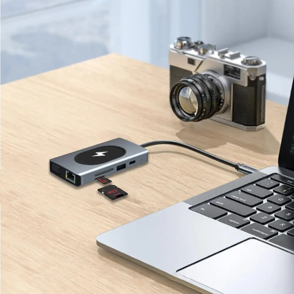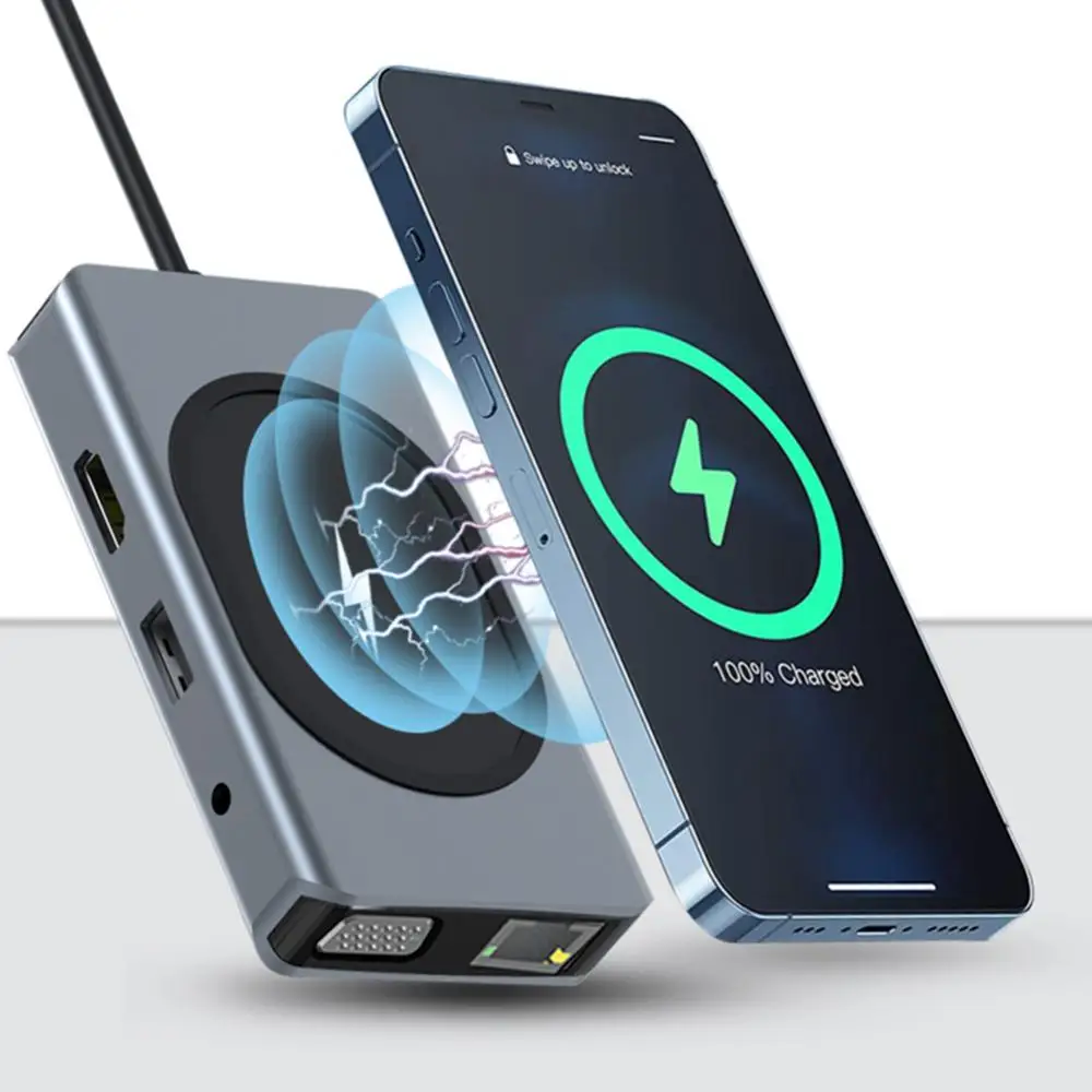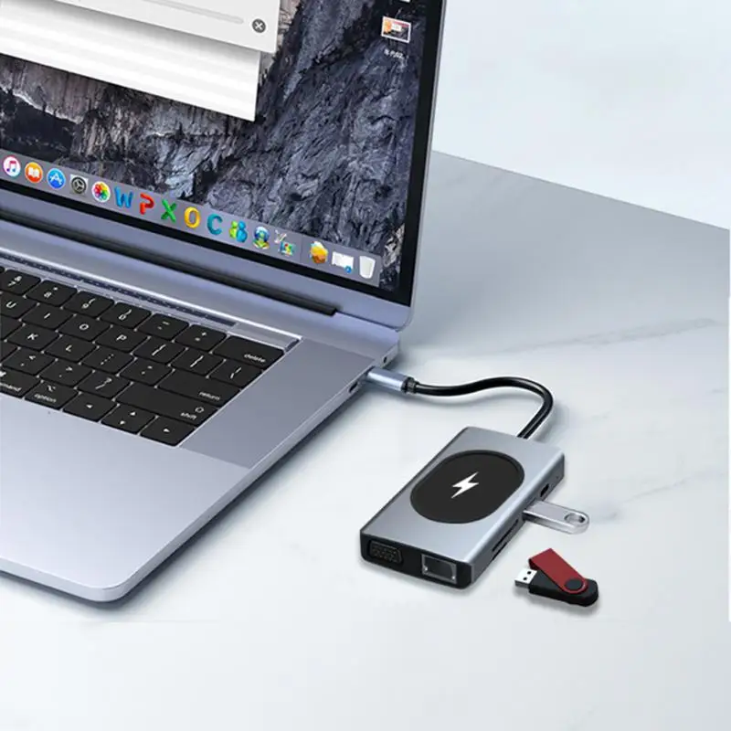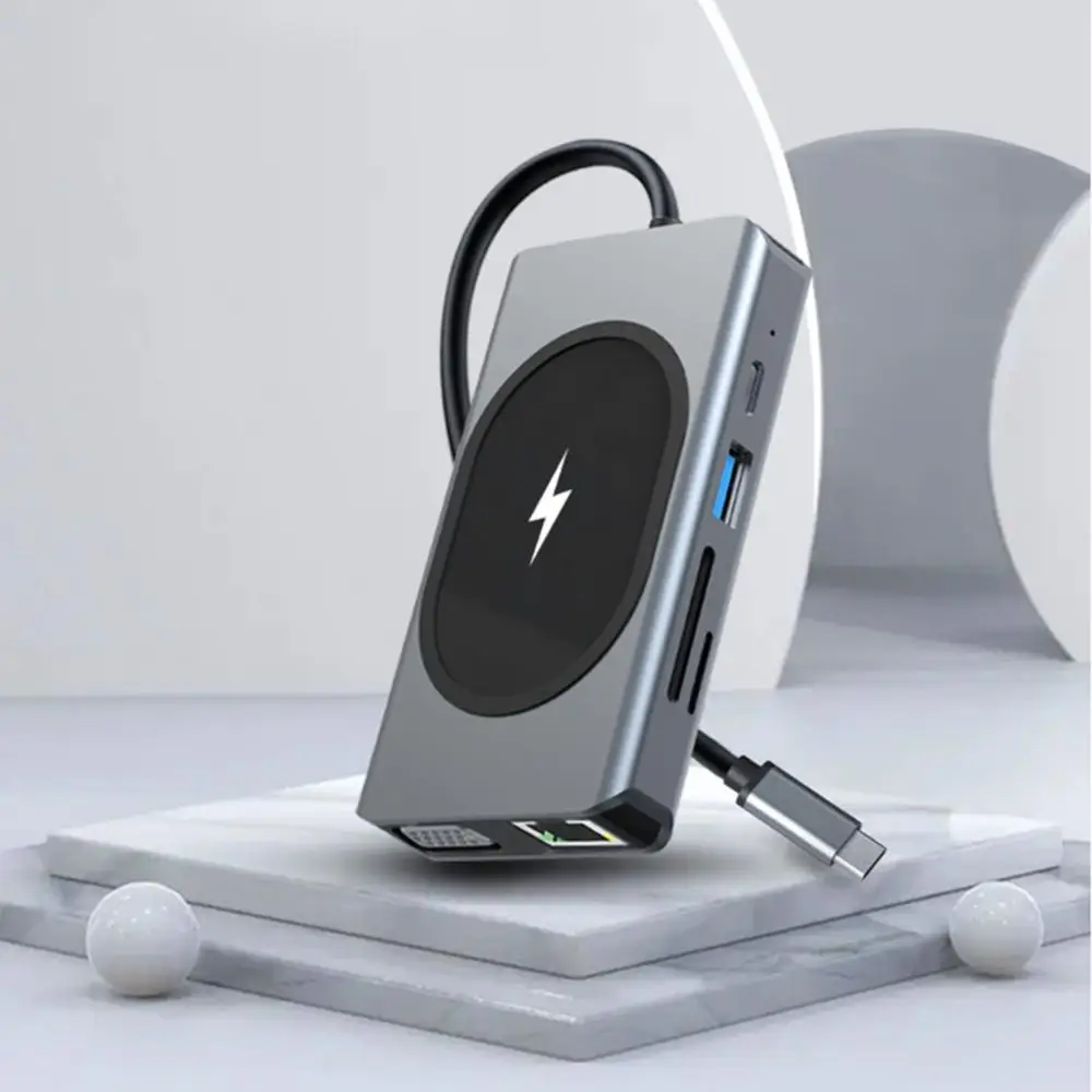 Tipo C A + VGA + USB * 2 + RJ45 + SD + TF + 3,5 AUDIO + PD + cargador inalámbrico de 15W
