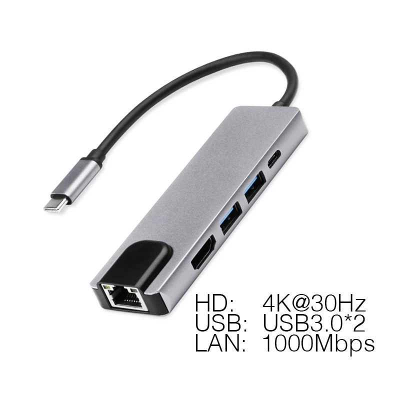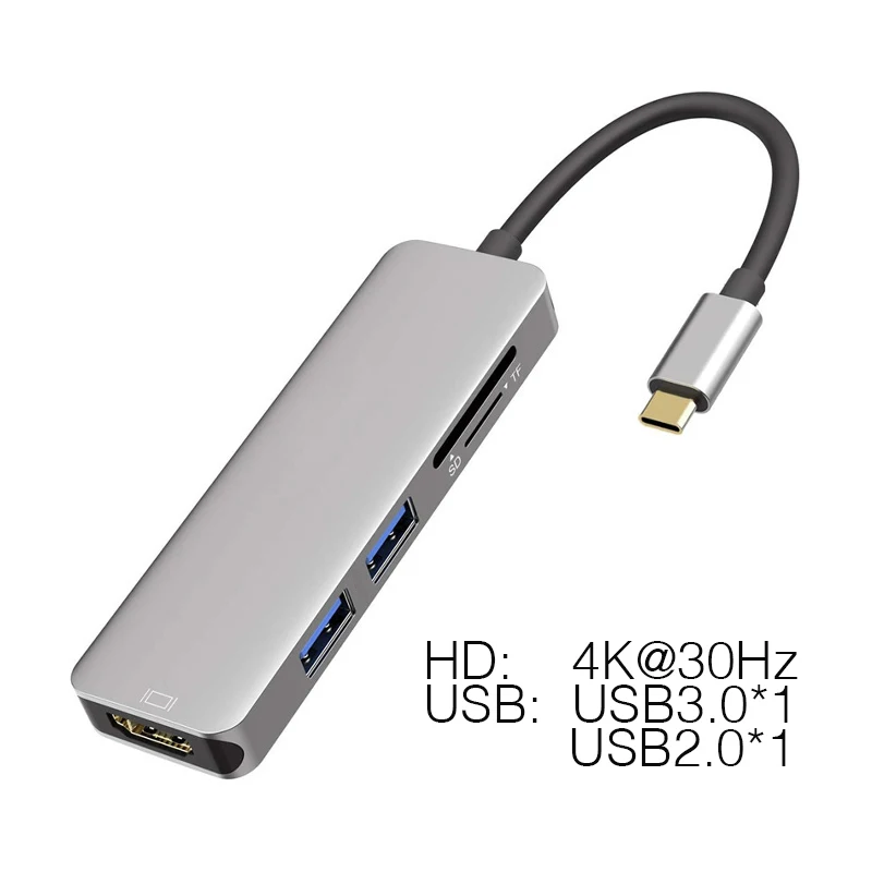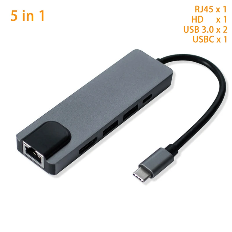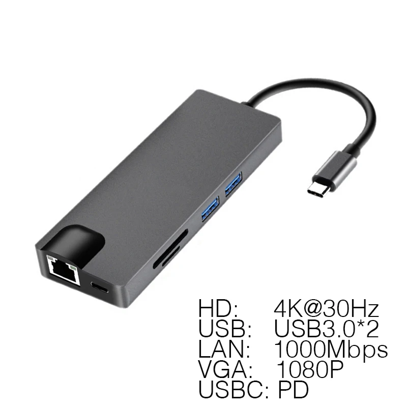 Característica: RJ45--1000M Gigabite Ethernet (RJ45 5 en 1/8 en 1) Compatible con HDMI. 4K a 30hz (5 en 1/HD/5 en 1 RJ45/8 en 1) VGA--1080P (8 en 1) USB C -- admite carga PD (RJ45 5 en 1/8 en 1) SD -- admite una lectura máxima de 128G (HD 5 en 1/8 en 1) TF -- admite una lectura máxima de 128G (HD 5 en 1/8 en 1) USB3.0 -- admite transferencia de datos de 5 Gbps (5 en 1 HD/5 en 1 RJ45/8 en 1)