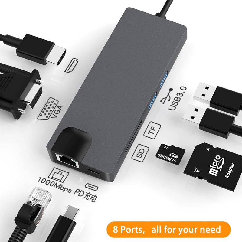 8 en 1 Tipo C Hub USB C a HDMI compatible con HDTV VGA USB 3,0 SD/TF lector RJ45 1000M USB-C entrega de potencia para MacBook Pro adaptador