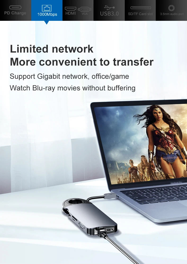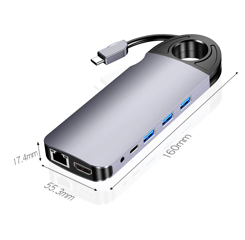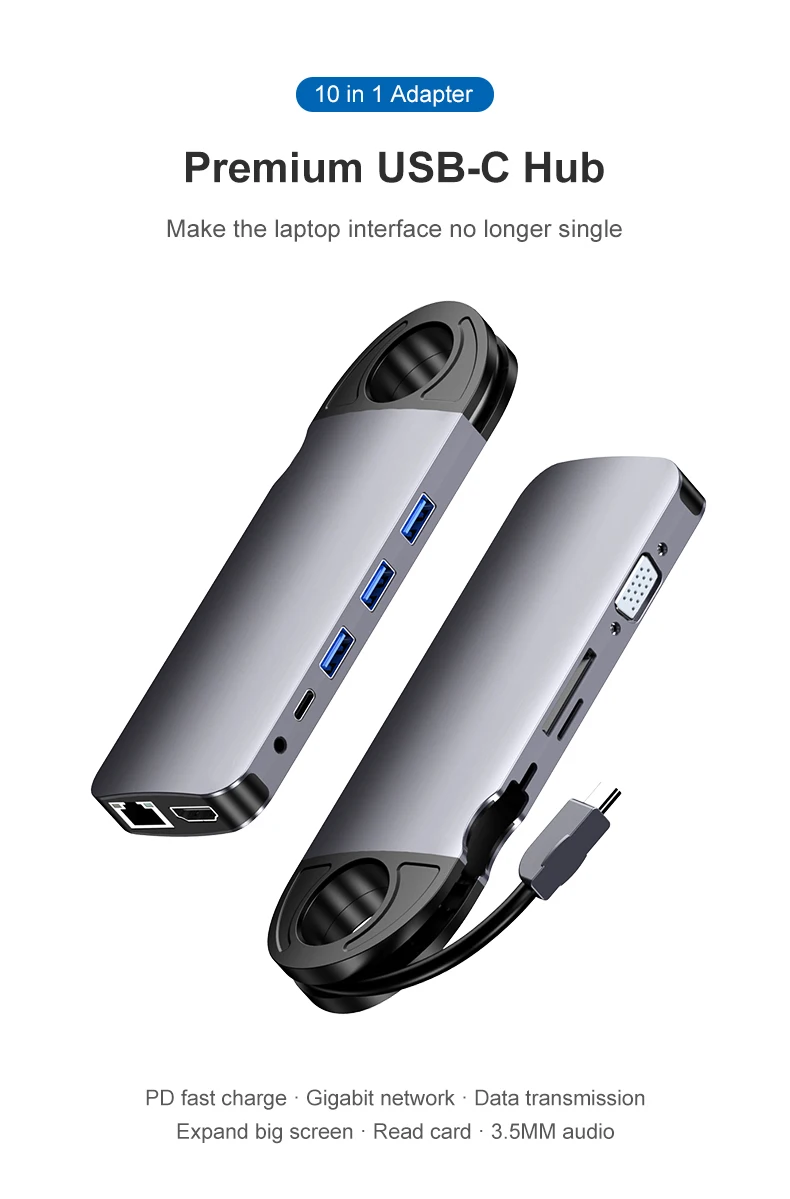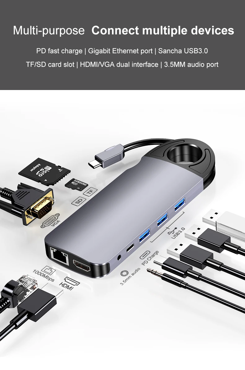 Comprar Concentrador de red tipo C a RJ45, Cable Gigabit Ethernet 4K, HDMI, TV, 60W, PD, carga VGA, 3,5mm, Audio, SD, tarjeta TF, USB 3,0 para MacBook Pro, 10 en 1