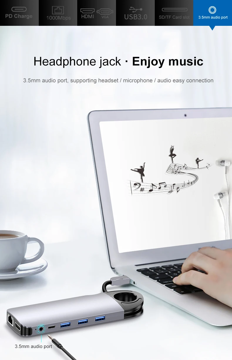 3. Puerto de audio de 5mm, compatible con auriculares/micrófono/audio fácil conexión.