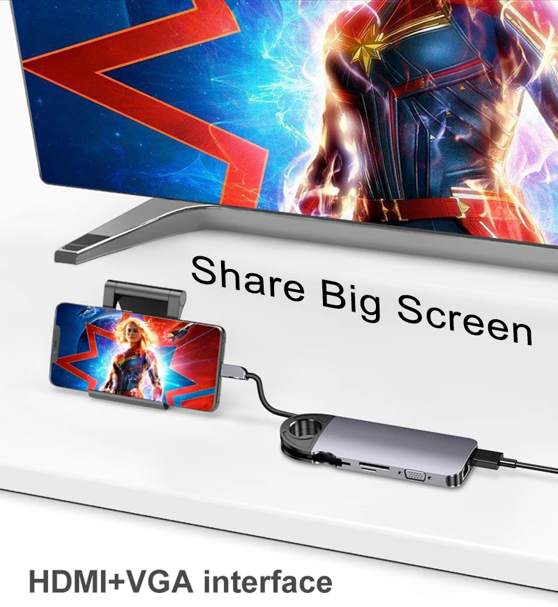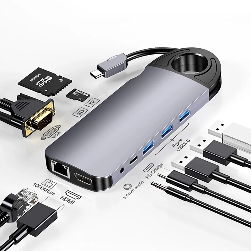 Comprar Concentrador de red tipo C a RJ45, Cable Gigabit Ethernet 4K, HDMI, TV, 60W, PD, carga VGA, 3,5mm, Audio, SD, tarjeta TF, USB 3,0 para MacBook Pro, 10 en 1