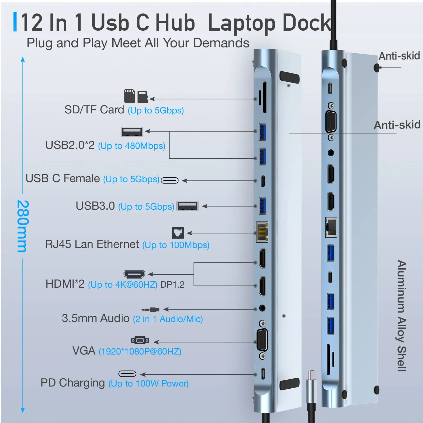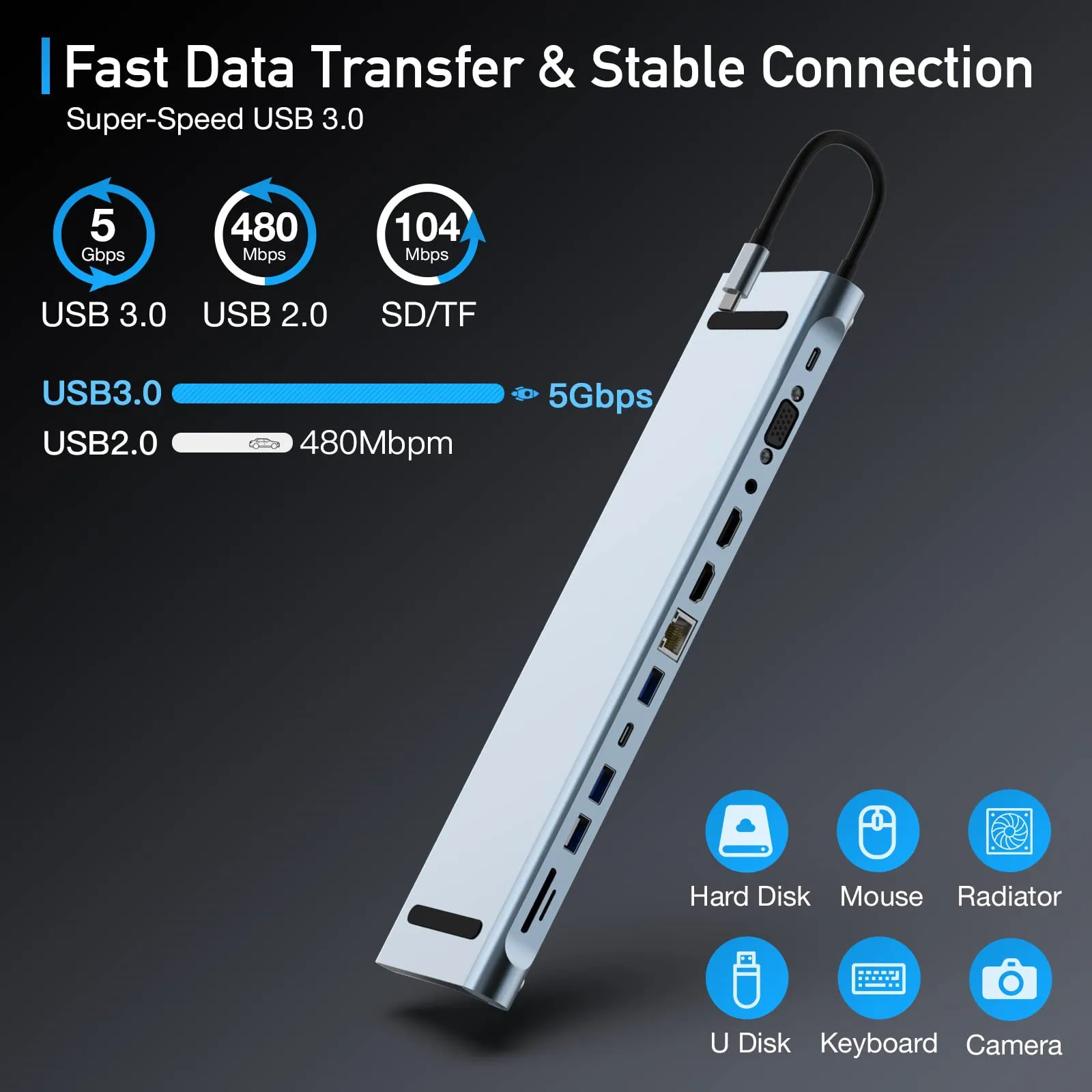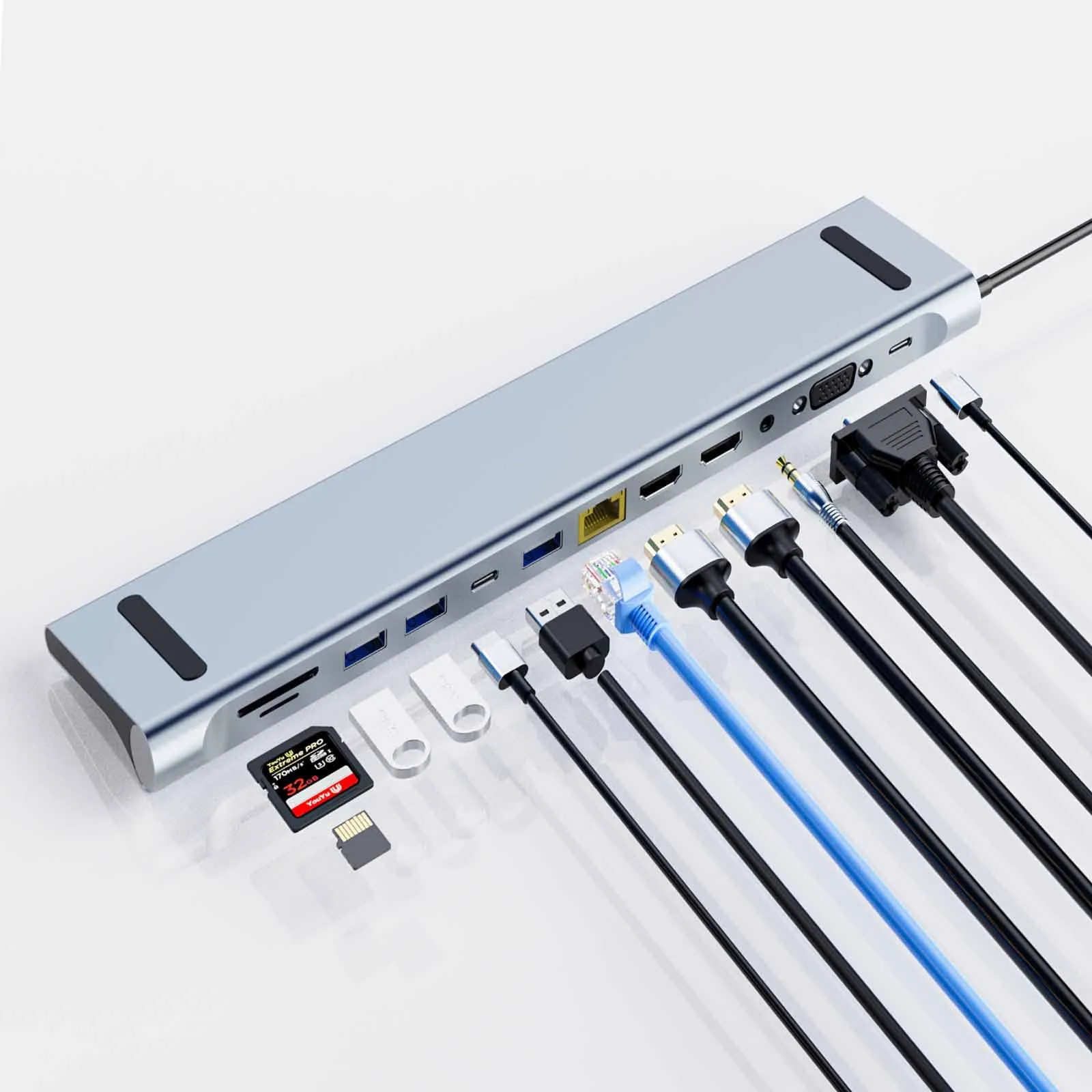 Comprar Concentrador de red USB 12 en 1, adaptador USB C con 4K, HDMI, VGA, USB-C, Thunderbolt, 3 Gigabit, Ethernet, Audio SD/TF para MacBook, estación de acoplamiento