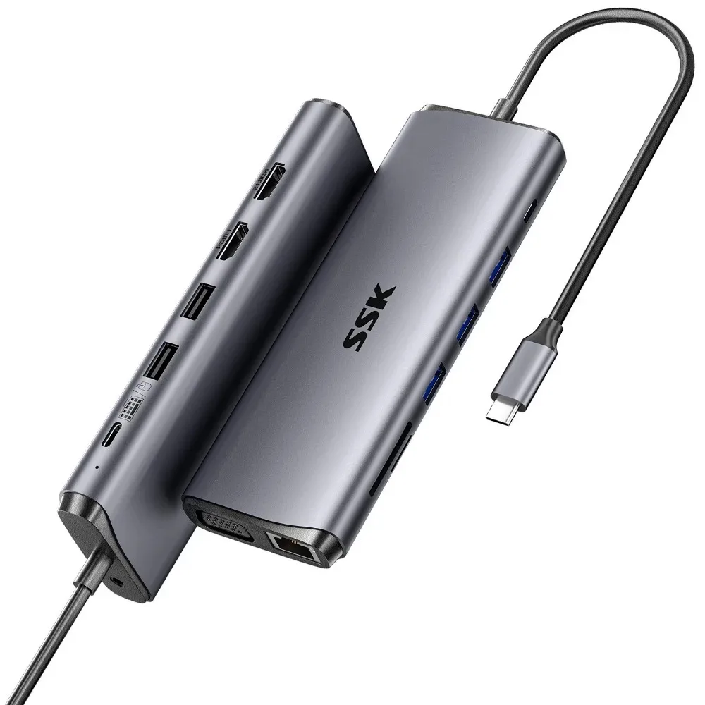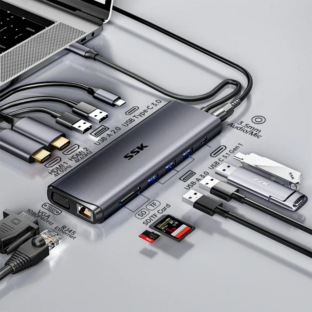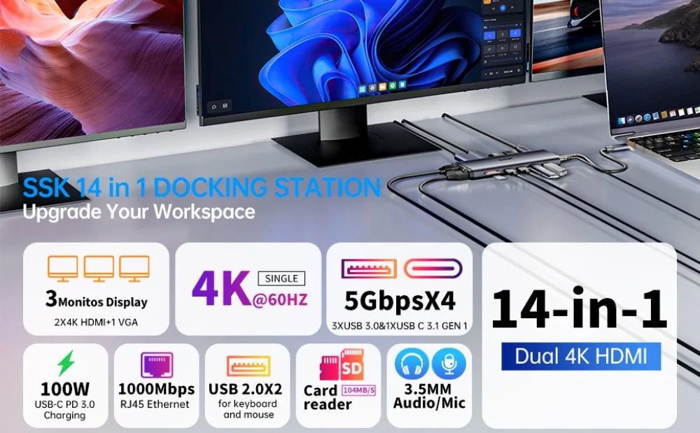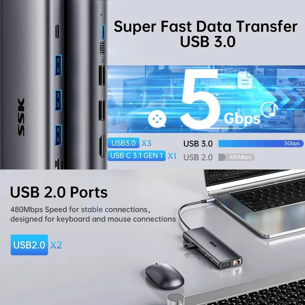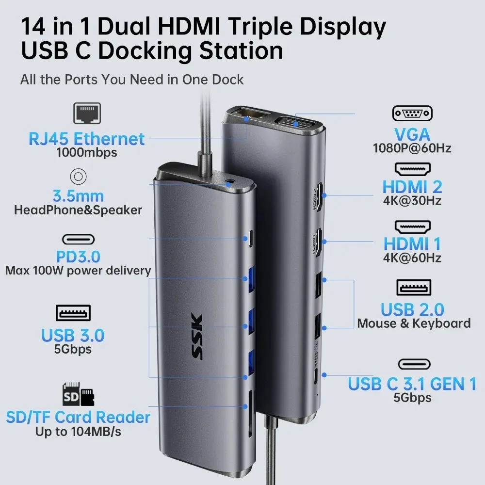 【 Adaptador multipuerto USB C 14 en 1, satisface todas sus necesidades】Estación de acoplamiento para computadora portátil SSK 14 en 1 USB C, equipada con puertos HDMI 2*4K y 1 puerto VGA, tiene pantalla de monitor triple, 5 USBs,3 de los cuales son puertos USB 3,0, velocidad de transferencia de hasta A 5Gbps,2 son Puerto USB 2,0 para facilitar su uso del ratón y el teclado, 1*100W PD3.0 tipo C puerto de carga rápida, 1 puerto de datos USB C 3,1 Gen1, audio/micrófono de 3,5mm, lector de tarjetas Ethernet RJ45 y SD/TF de 1000Mbps, velocidad de lectura de hasta 104Mbps, que puede leer tarjetas SD y TF al mismo tiempo
