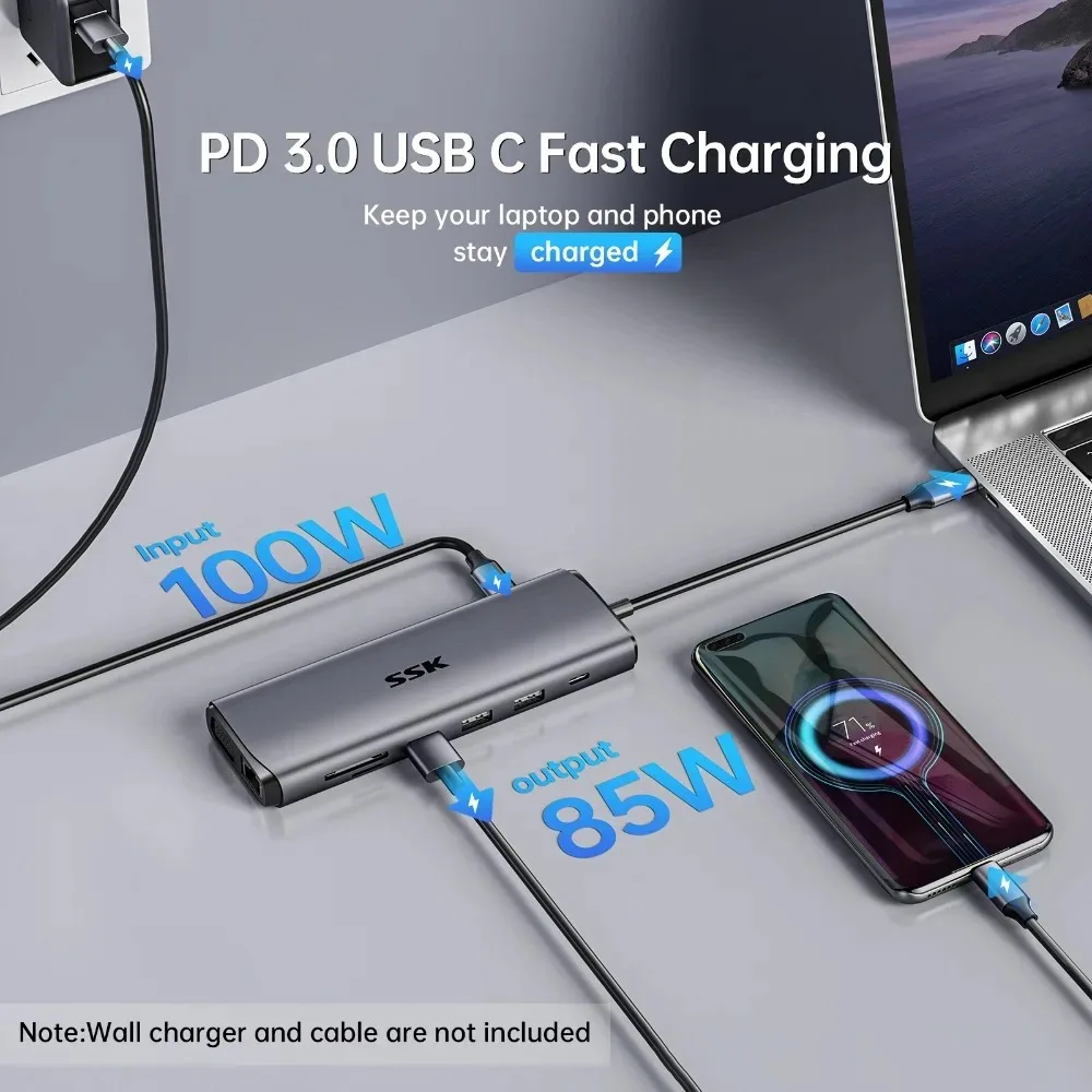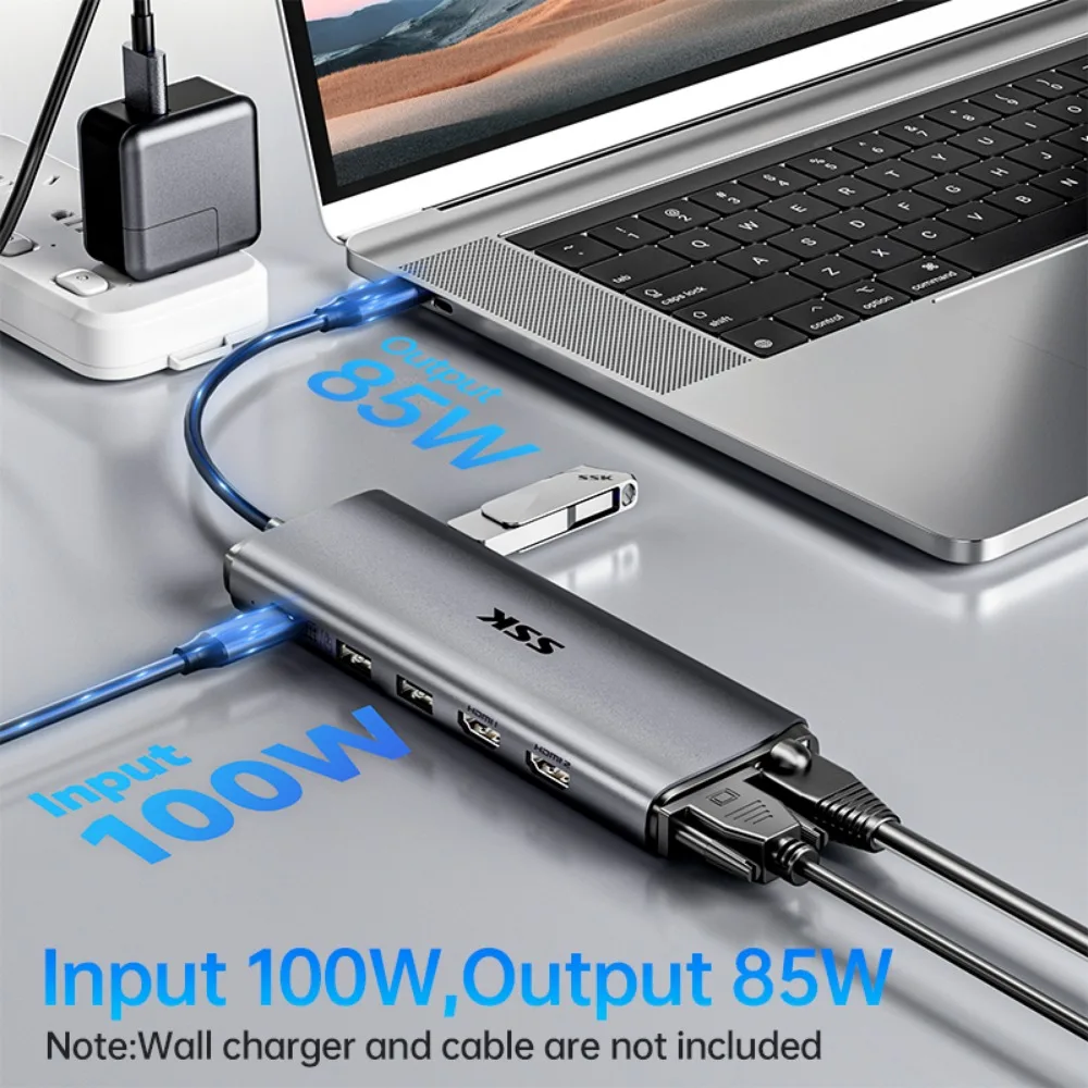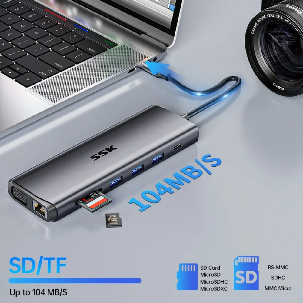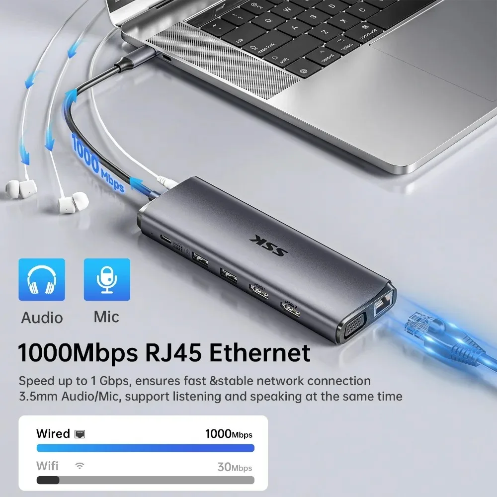 【 Adaptador multipuerto USB C 14 en 1, satisface todas sus necesidades】Estación de acoplamiento para computadora portátil SSK 14 en 1 USB C, equipada con puertos HDMI 2*4K y 1 puerto VGA, tiene pantalla de monitor triple, 5 USBs,3 de los cuales son puertos USB 3,0, velocidad de transferencia de hasta A 5Gbps,2 son Puerto USB 2,0 para facilitar su uso del ratón y el teclado, 1*100W PD3.0 tipo C puerto de carga rápida, 1 puerto de datos USB C 3,1 Gen1, audio/micrófono de 3,5mm, lector de tarjetas Ethernet RJ45 y SD/TF de 1000Mbps, velocidad de lectura de hasta 104Mbps, que puede leer tarjetas SD y TF al mismo tiempo