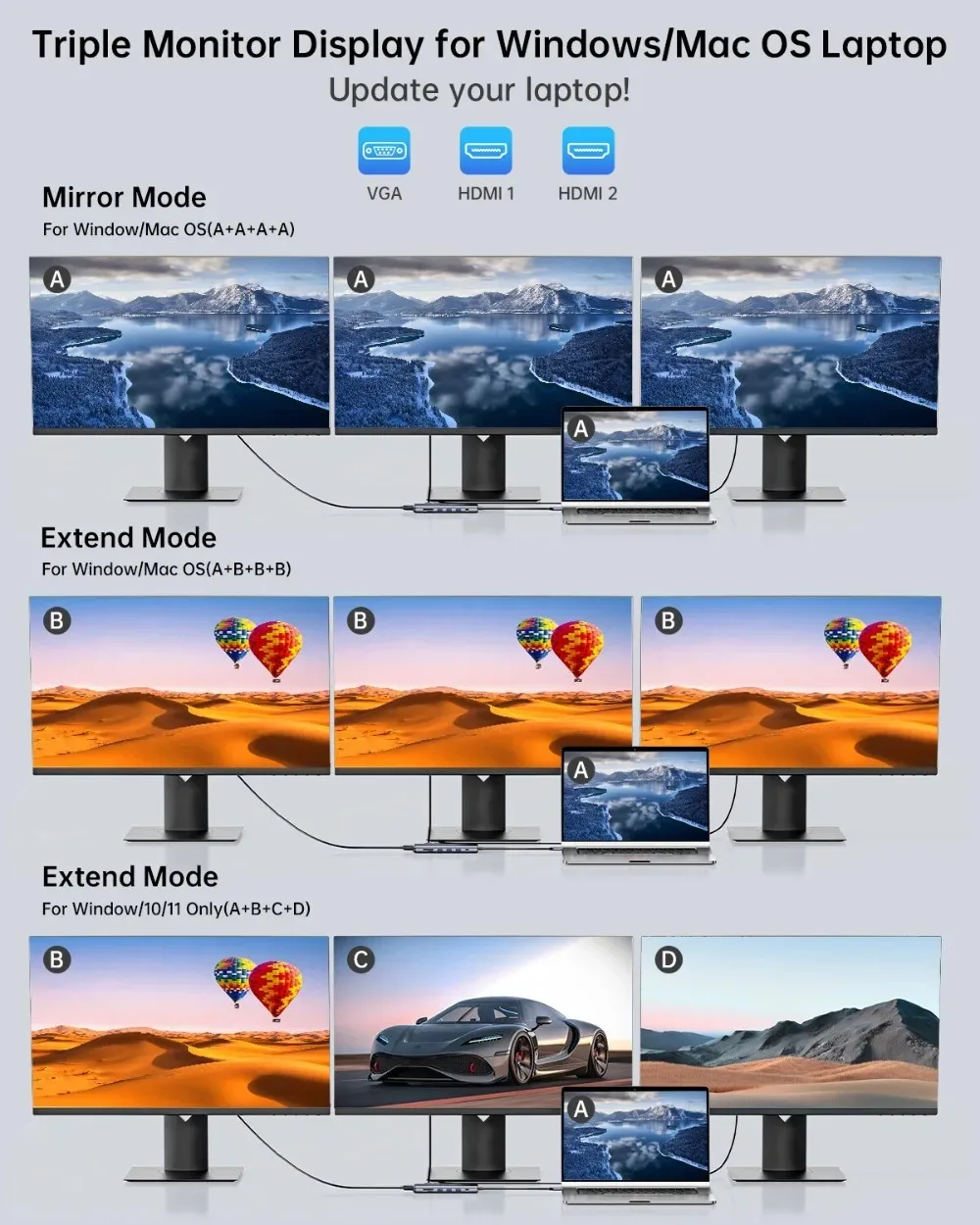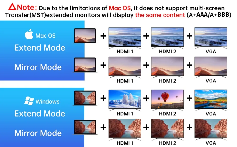 【Triple Pantalla】Esta estación de acoplamiento dual HDMI admite el modo espejo (SST) y el modo de extensión (MST) con 2 HDMI y VGA(HDMI y VGA se pueden usar al mismo tiempo),. que ampliará fácilmente la computadora portátil con otros monitores triples. La resolución máxima de un solo HDMI puede alcanzar 4K/60Hz, resolución máxima de HDMI dual: 4K/30Hz. Cuando VGA está conectado, cada monitor tiene una resolución máxima: 1080P/60Hz. Para Mac Os solo admite el modo SST, todos los monitores externos serán iguales (A + AAA o A + BBB); para Win10 y 11, admite pantallas cuádruples (A + BCD)