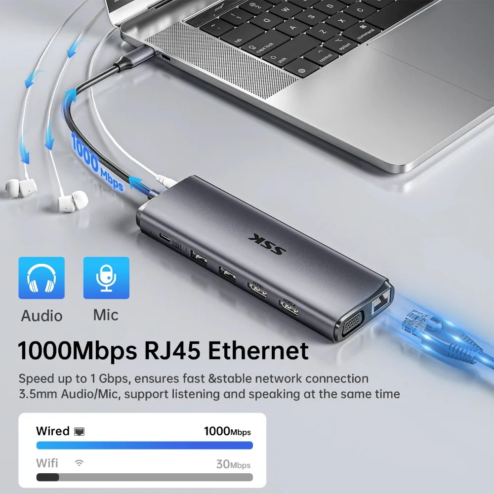 【 Adaptador multipuerto USB C 14 en 1, satisface todas sus necesidades】Estación de acoplamiento para computadora portátil SSK 14 en 1 USB C, equipada con puertos HDMI 2*4K y 1 puerto VGA, tiene pantalla de monitor triple, 5 USBs,3 de los cuales son puertos USB 3,0, velocidad de transferencia de hasta A 5Gbps,2 son Puerto USB 2,0 para facilitar su uso del ratón y el teclado, 1*100W PD3.0 tipo C puerto de carga rápida, 1 puerto de datos USB C 3,1 Gen1, audio/micrófono de 3,5mm, lector de tarjetas Ethernet RJ45 y SD/TF de 1000Mbps, velocidad de lectura de hasta 104Mbps, que puede leer tarjetas SD y TF al mismo tiempo