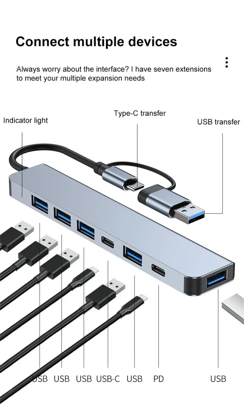 1 ~ 5 piezas 7 puertos 2 en 1 USB 3,0 HUB Tipo-c Adaptador USB 2,0 Transmisión de alta velocidad Multipuerto USB Splitter Expansor para PC