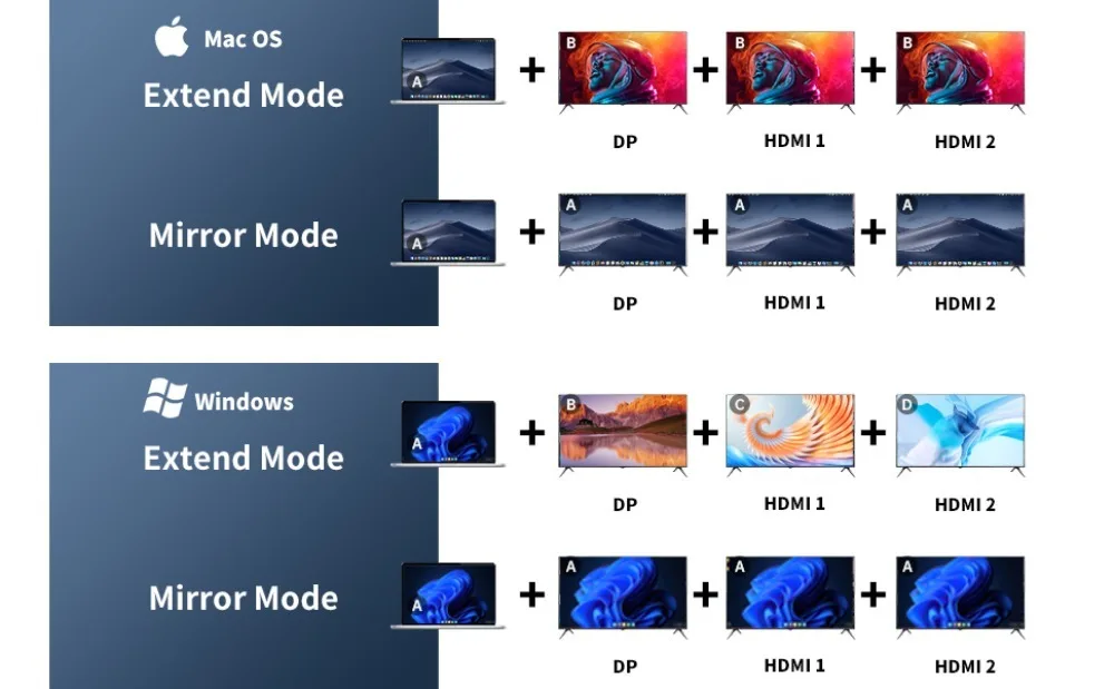 【Triple Monitor de estación de acoplamiento para computadora portátil Thunderbolt】Esta nueva estación de acoplamiento para computadora portátil de actualización viene con pantallas triples: 1 pantalla 4K 60Hz de salida HDMI1, 1 pantalla 4K 30Hz de HDMI2, 1 puerto de pantalla (4K60Hz) emite CALIDAD DE VIDEO 4K de alta definición (su computadora portátil necesita admitir la salida DP1.4). Para el sistema operativo Windows, estos cargadores y estaciones de acoplamiento para portátiles admiten Dual HDMI + DP para mostrar 3 pantallas diferentes. Para el sistema Mac, no admite extender diferentes pantallas. Tecla de acceso directo del interruptor de pantalla: windows + P