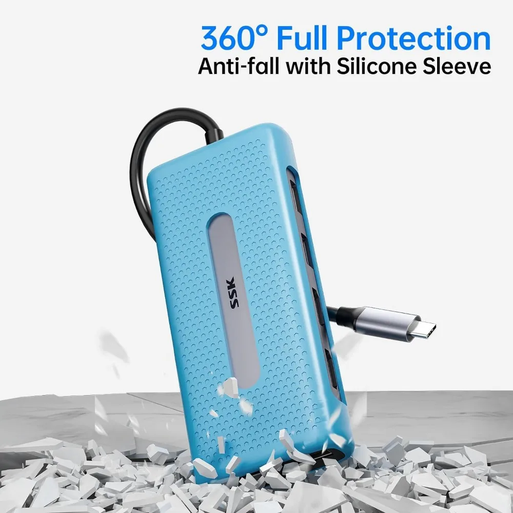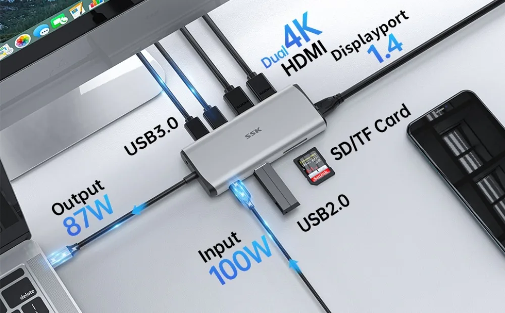 【Estación de acoplamiento con 2 puertos HDMI para la estación de acoplamiento con 2 puertos HDMI】La base SSK Thunderbolt ha combinado la función de concentrador USB C y la base USB C casi satisfará sus necesidades: 2 puertos HDMI 4K con pantallas HDMI duales conectadas, puerto de pantalla 4K 60Hz, Puerto Ethernet/3,0, 2 puertos USB, 1 puerto USB 2,0 para ratón y teclado inalámbricos, El puerto de audio de 3,5mm admite micrófono y audio, puerto de carga tipo C PD3.0 de 100W, lector de tarjetas SD/TF. La ranura para tarjetas SD y la ranura para tarjetas TF se pueden usar en la base para portátil USB C.