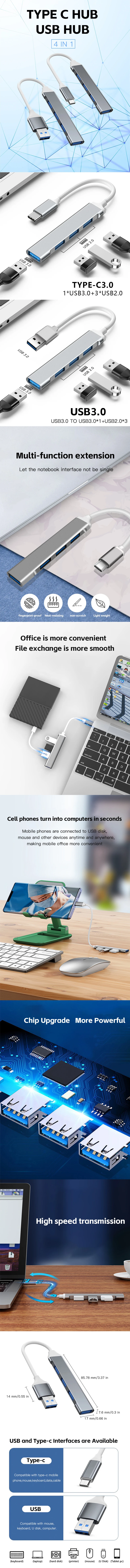 • 4 puertos 4 en 1 USB C Hub:Con 4 puertos y la capacidad de conectar 4 dispositivos, este concentrador USB C es perfecto para aquellos que necesitan conectar varios dispositivos a la vez.
