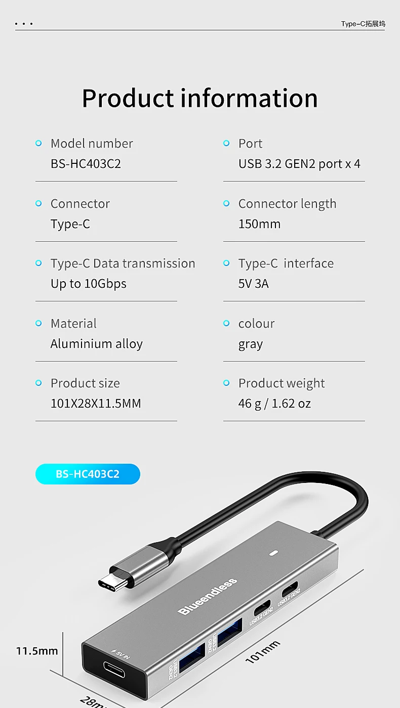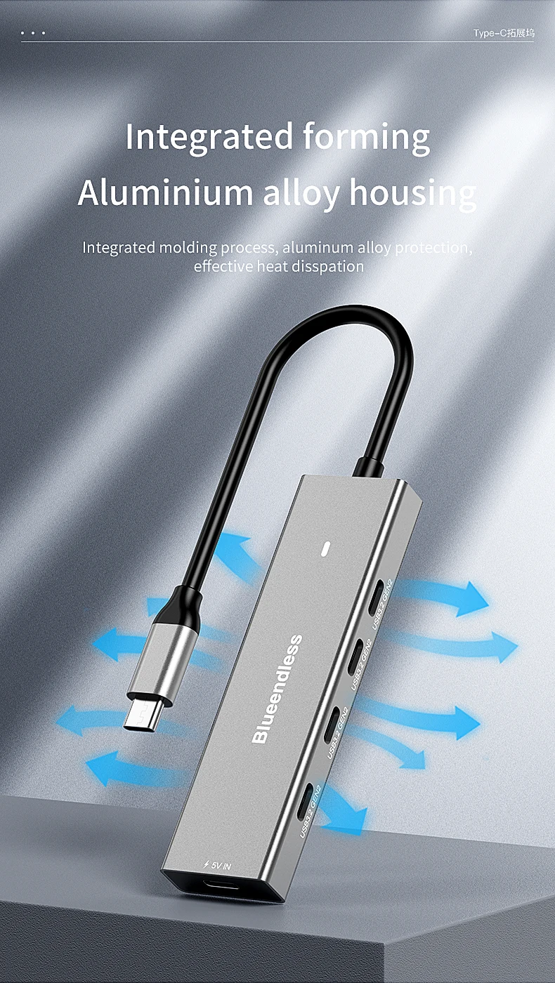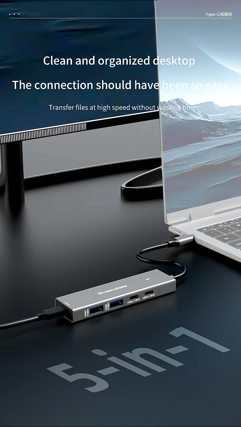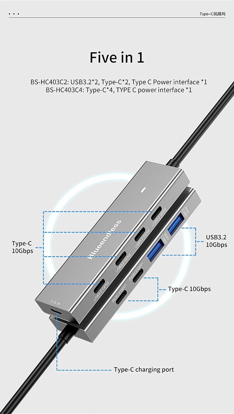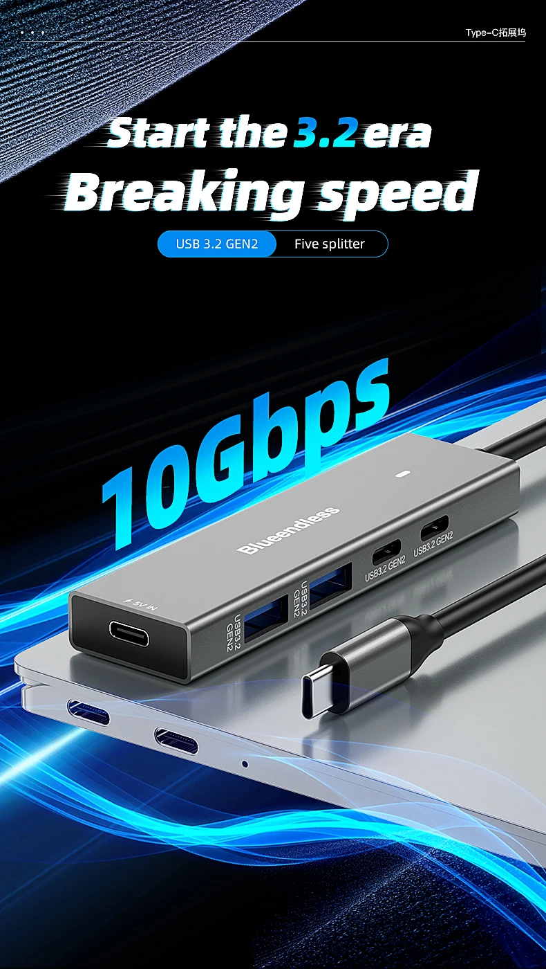 5 En 1 tipo-c USB HUB 2A + 2C de alta velocidad USB3.2 Gen2 10Gbps aluminio USB C divisor multipuerto adaptador USB expansor para PC portátil