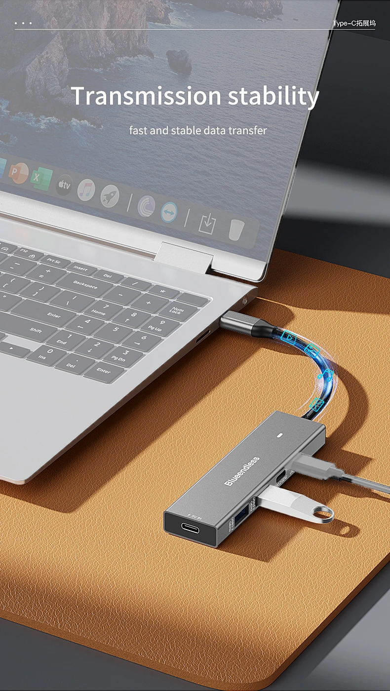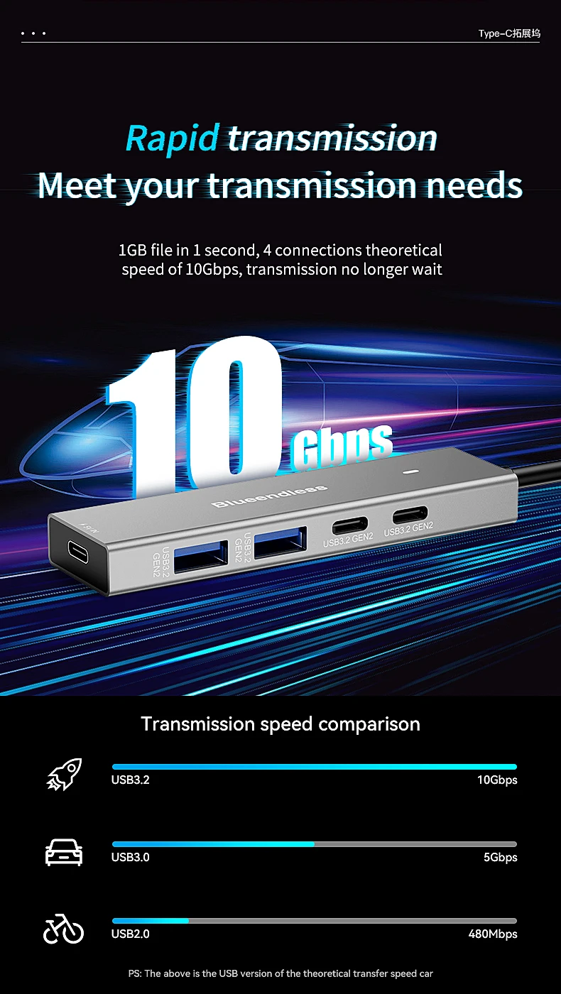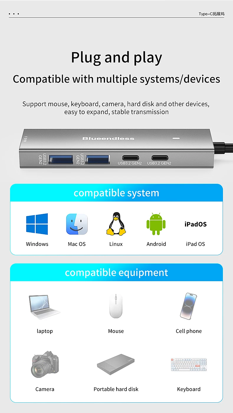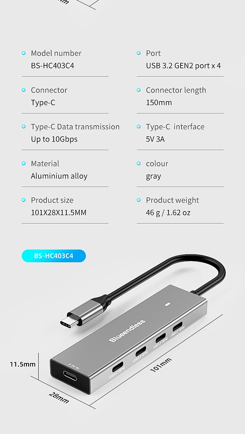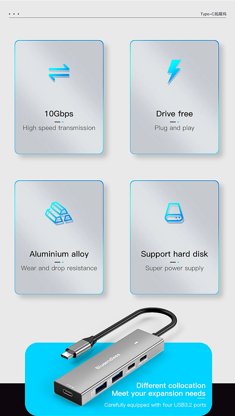 5 En 1 tipo-c USB HUB 2A + 2C de alta velocidad USB3.2 Gen2 10Gbps aluminio USB C divisor multipuerto adaptador USB expansor para PC portátil