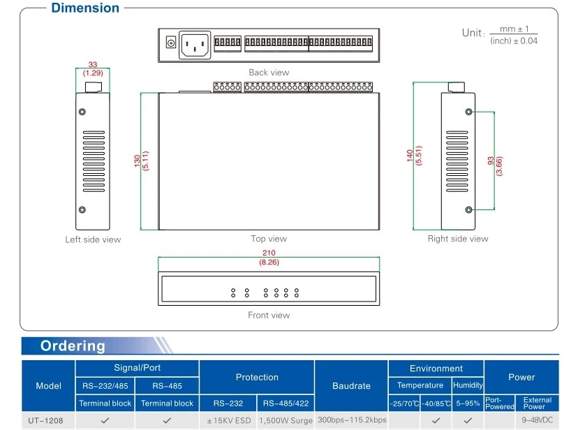 Comprar Concentrador de UT-1208 de RS-232/RS-485 a 8 puertos (Riel Din), 8 puertos RS485 Hub, instrucciones, 600W, protección contra sobretensiones
