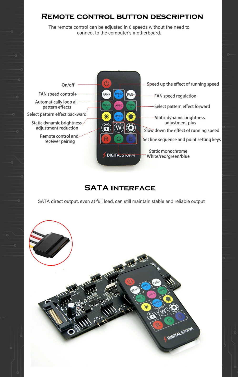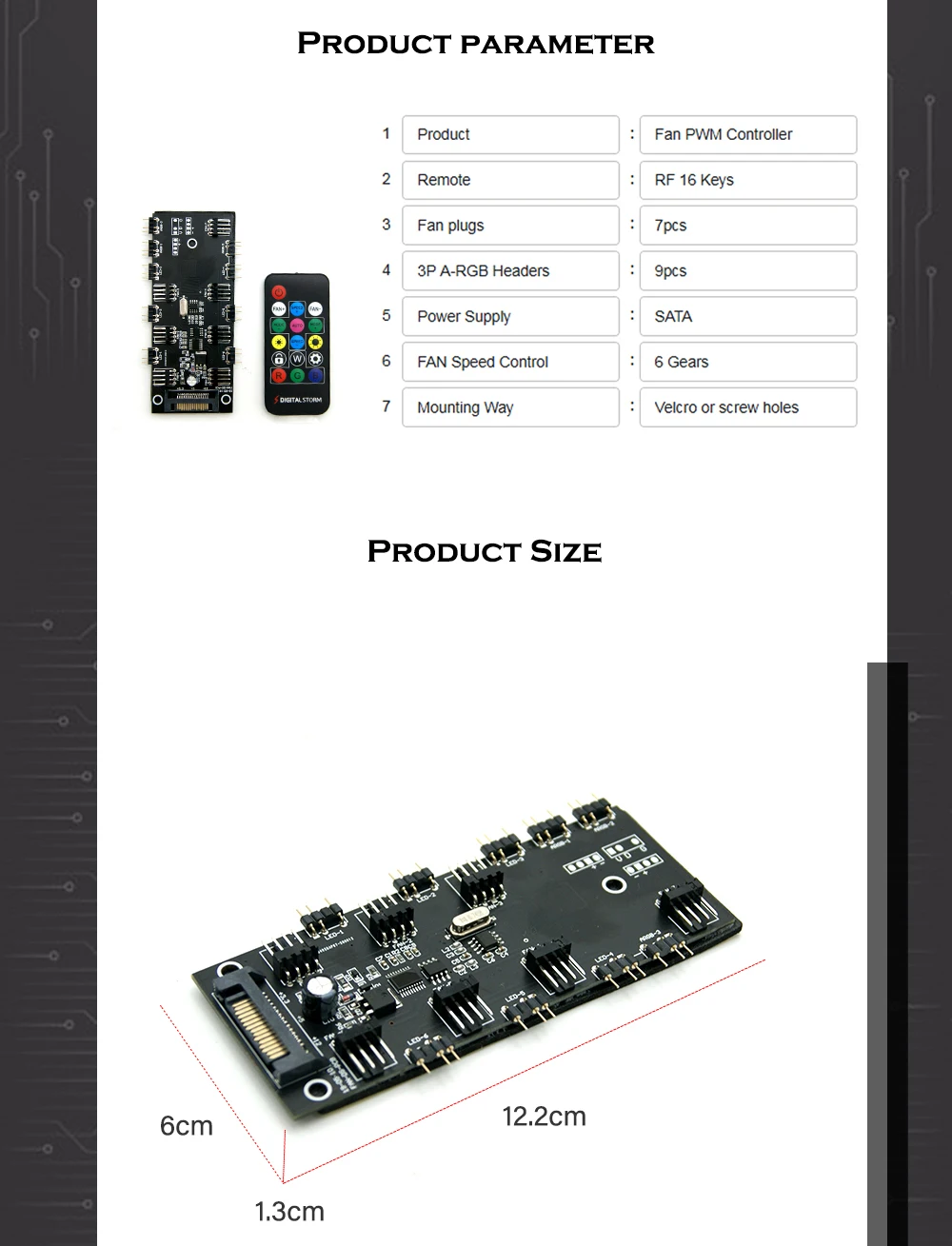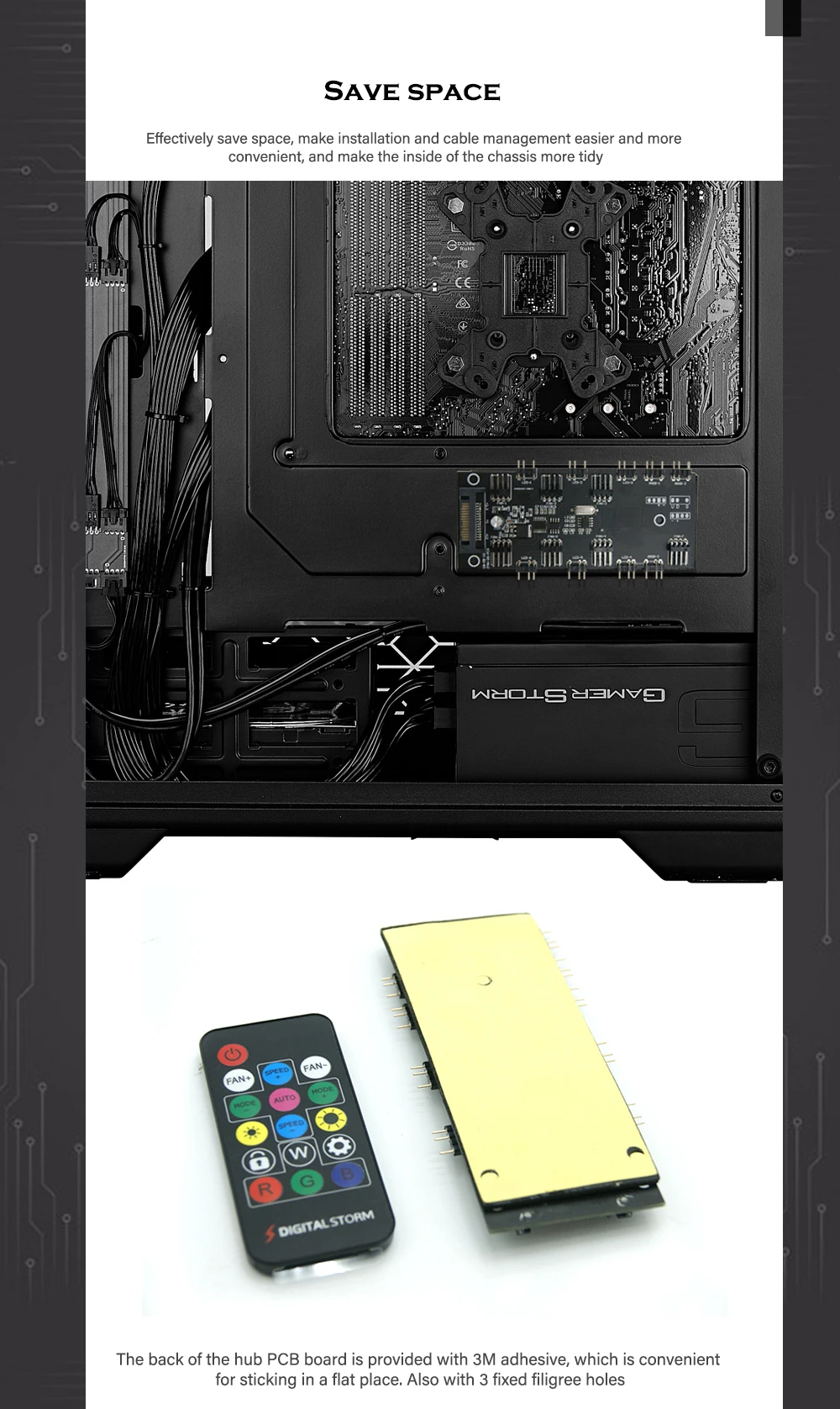 2. El control remoto se puede ajustar en 6 velocidades sin necesidad de conectarse a la placa base del ordenador. La parte posterior de la placa PCB del cubo está provista de un adhesivo de 3M, que es conveniente para pegar en un lugar plano. También con 3 agujeros fijos de filigrana