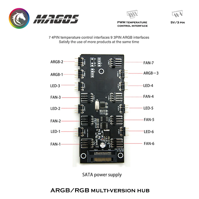 1. Interfaz extendida de 7 X ventiladores de 4 pines, utilizando terminales compatibles con 3p y 4p 2510 para resolver la falta de interfaz de la placa base y el procesamiento centralizado de los cableados del ventilador