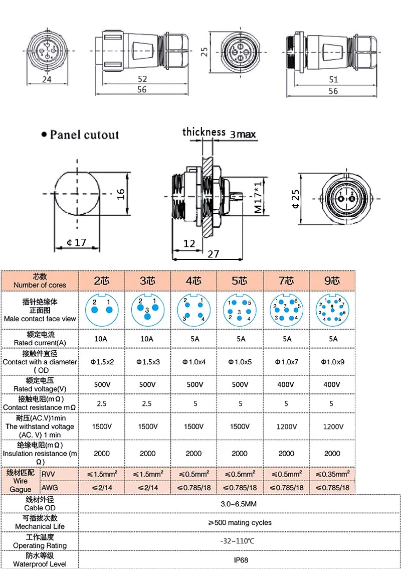 Parámetro de especificaciónMaterial de la carcasa: Termoplástico PA66Aislante: Termoplástico PPS resistente a altas temperaturas 260Material de contacto: cobre (chapado en oro, plateado)Anillo de sellado: gel de síliceGénero de la carcasa: asiento femenino MasculinoConexión: Conexión de roscaTemperatura de funcionamiento: -35 grados C ~ 110 grados CHumedad relativa: 90% ~ 95% (40 + 2 grados C)Sellado: En línea con IP68Diámetro del cable aplicable: diámetro 5,0 ~ 10mmVida mecánica: más de 500 veces