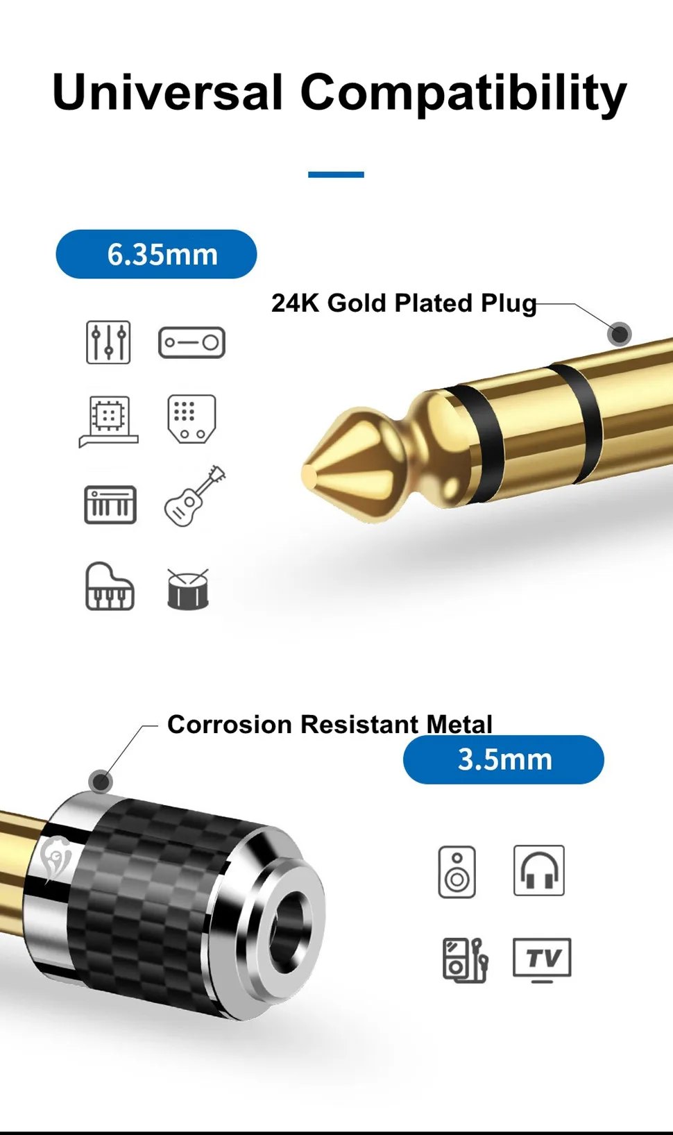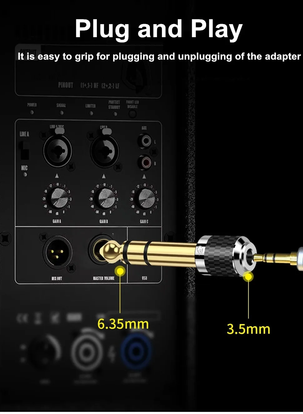 Los adaptadores de conector de Audio de 1/4 "a 3,5mm permiten que un puerto estéreo de 6,35mm conecte un cable auxiliar de enchufe de 3,5mm
