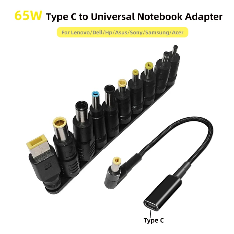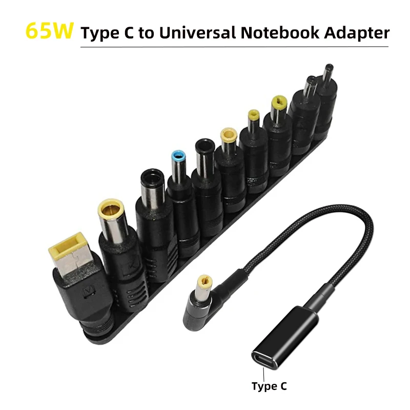 Adaptador Universal USB C de 65W para portátil, conector Dc Jack tipo C, Cable de carga, convertidor de cable a 10 enchufes para cargador de ordenador portátil