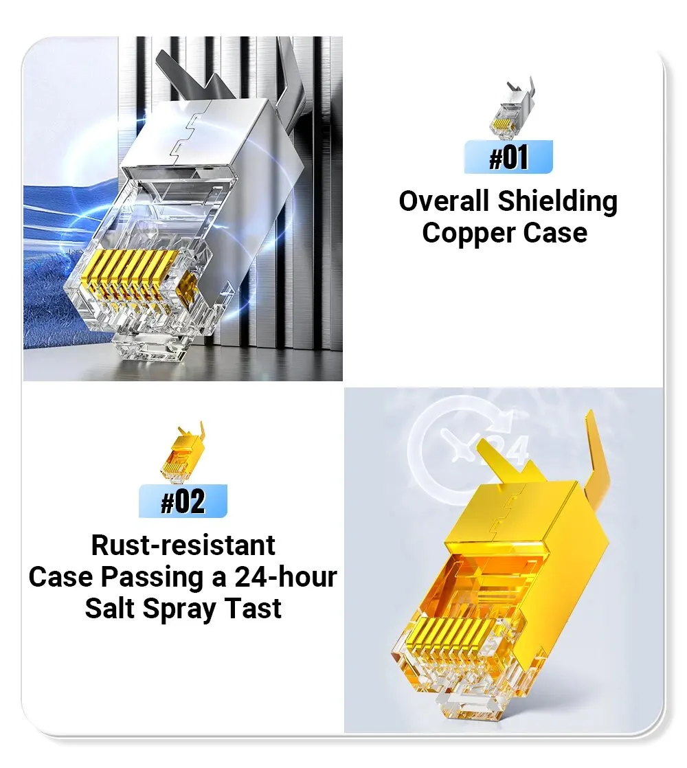✅Los contactos chapados en oro de 50 micrones proporcionan un contacto total con el conductor del cable y garantizan una excelente conductividad, manteniendo una transmisión de datos superior y confiable, soportando hasta10 Gigabitvelocidad de transmisión.