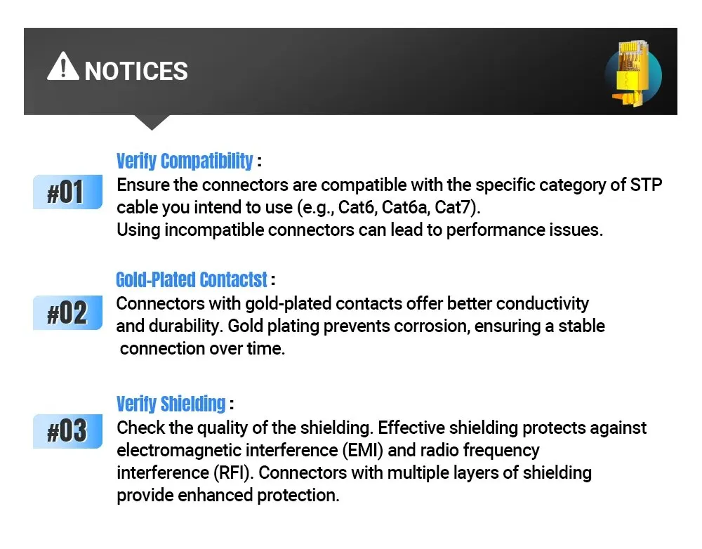 Asegúrese de que los conectores sean compatibles con la categoría específica de cable STP que intente usar (por ejemplo, Cat6, Cat6a, Cat7).El uso de conectores incompatibles puede provocar problemas de rendimiento.