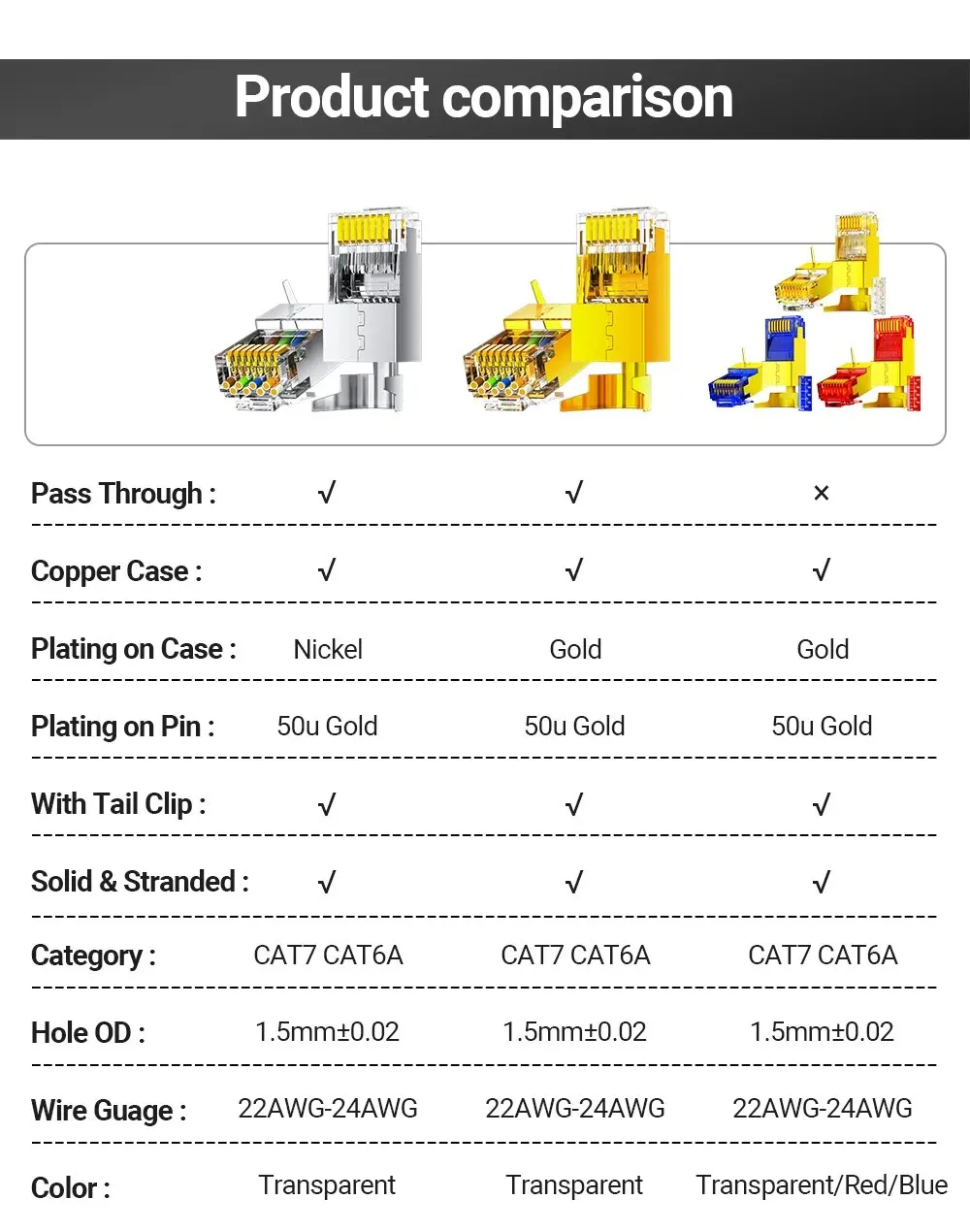 1. 1,5 mmTamaño del orificio: adecuado para conductores de cable CAT7 de 1,5 mm ± 0,02 mm 22-24 AWG CAT6A