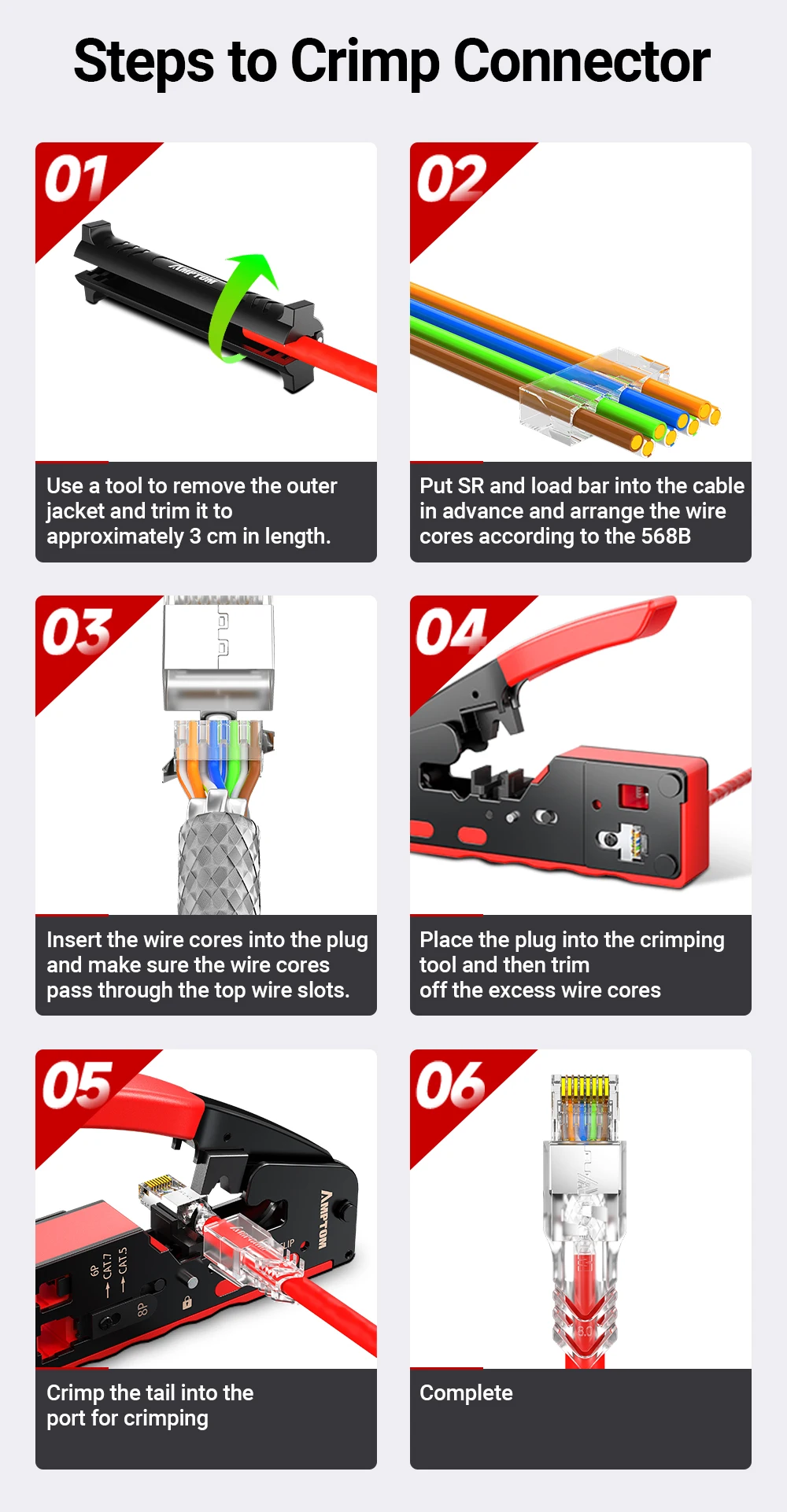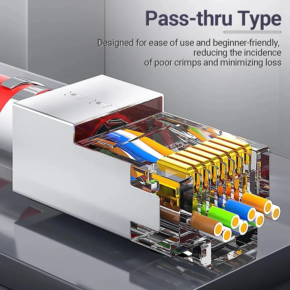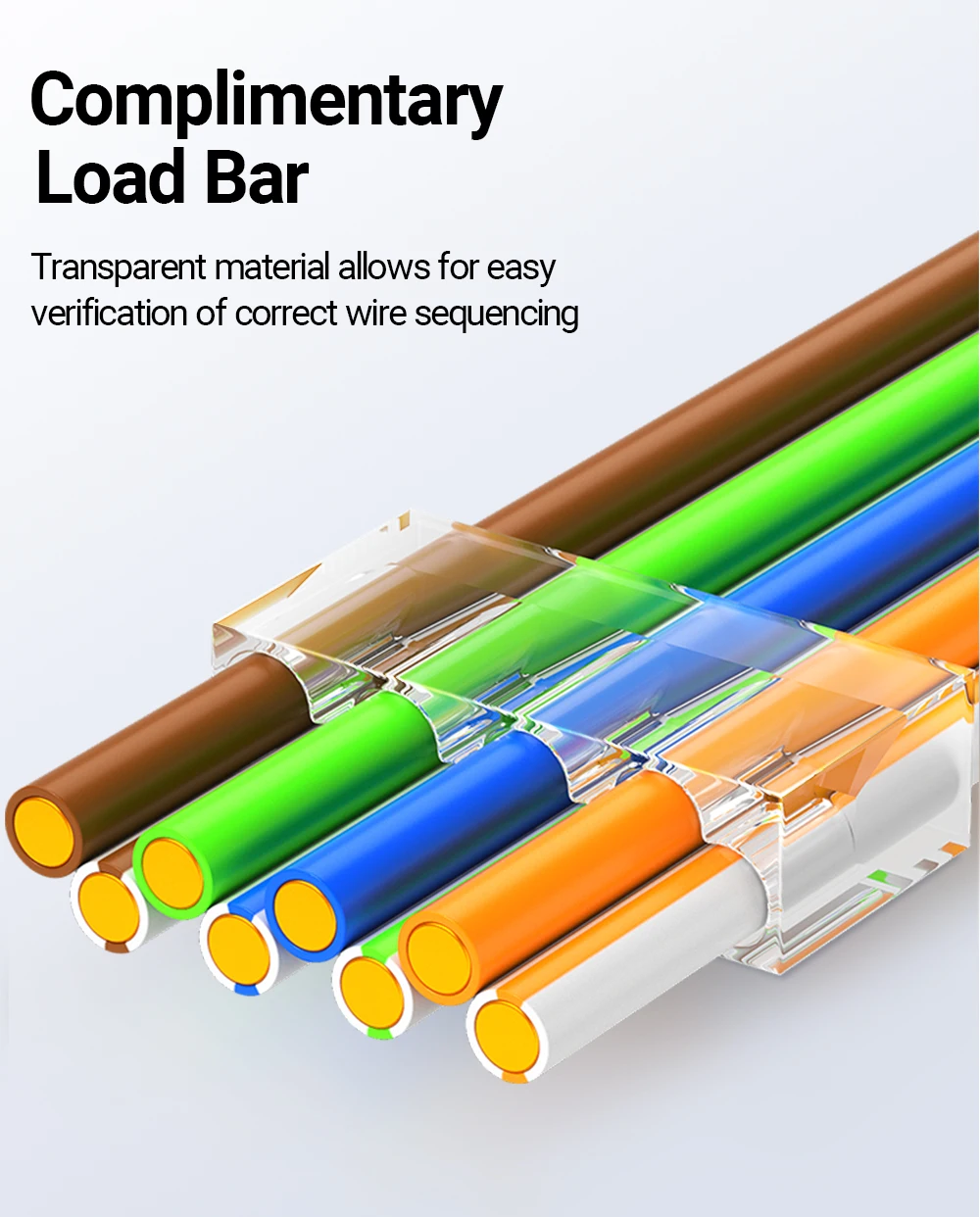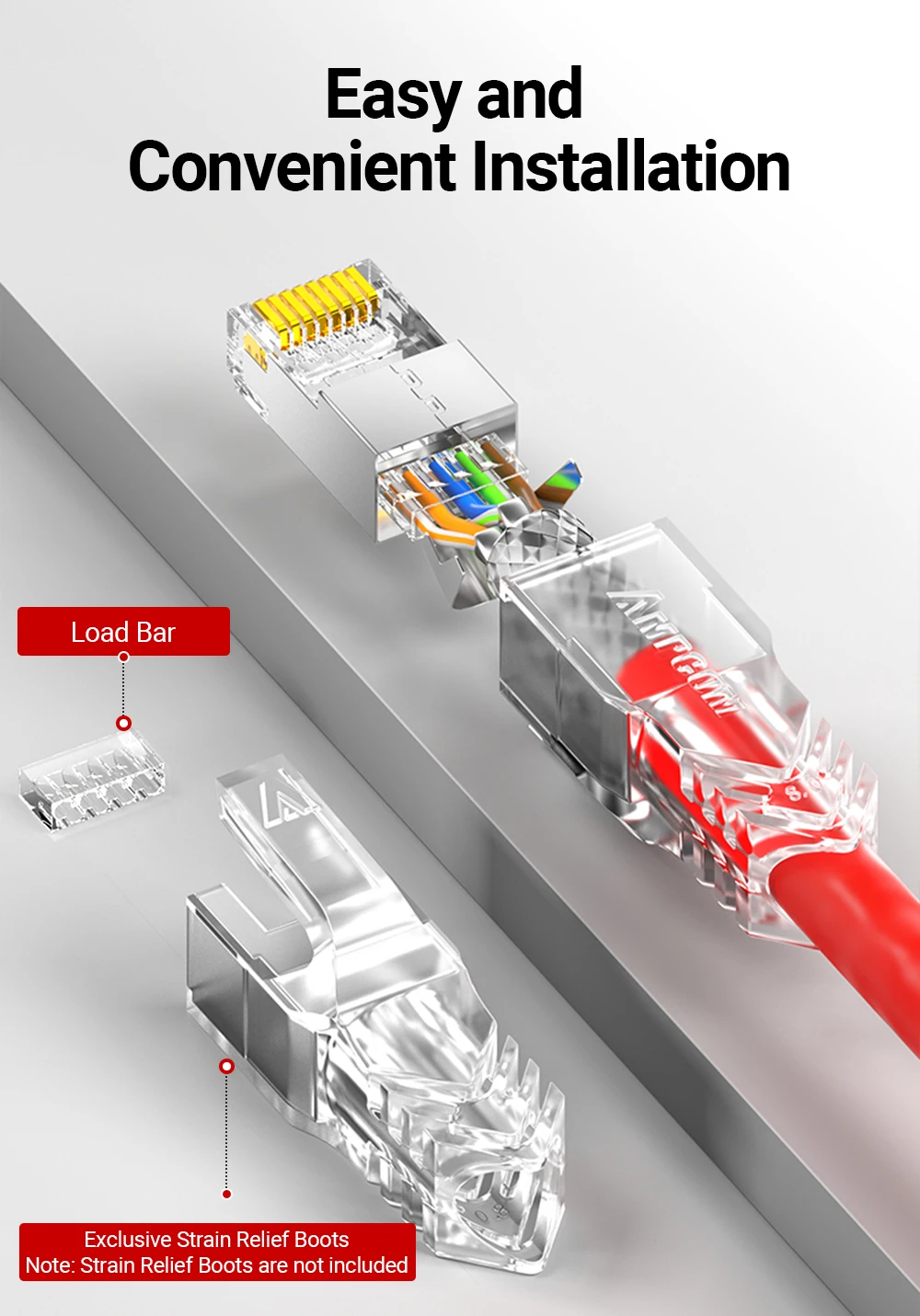 2 Piece Pass Through Design Save Your Time--It is generally difficult to install network cables with thick diameters. These crystal heads are equipped with transparent load bars. You can confirm the wire sequence before the insert them into the connector. This can greatly simplify serial authentication and shorten installation time.