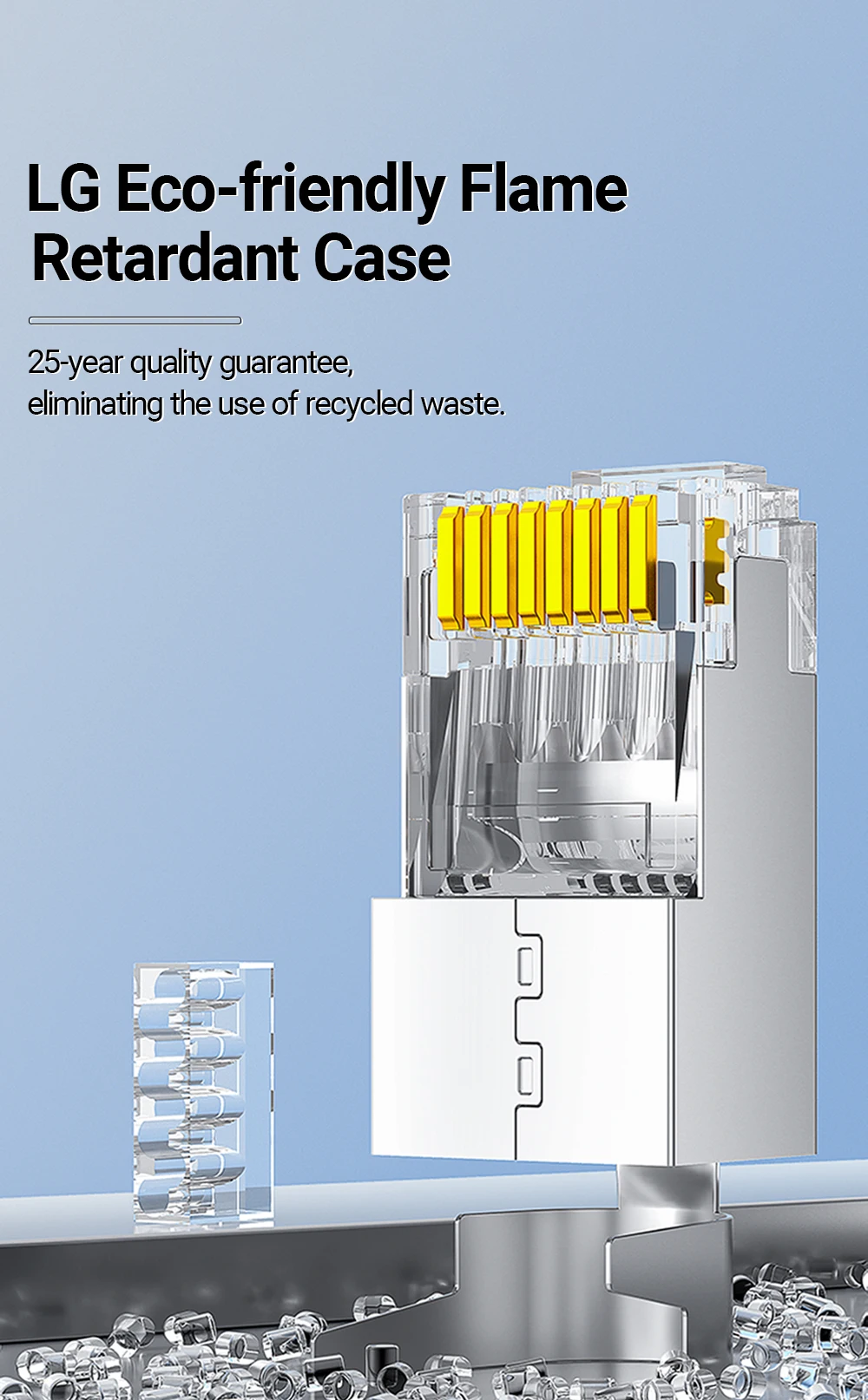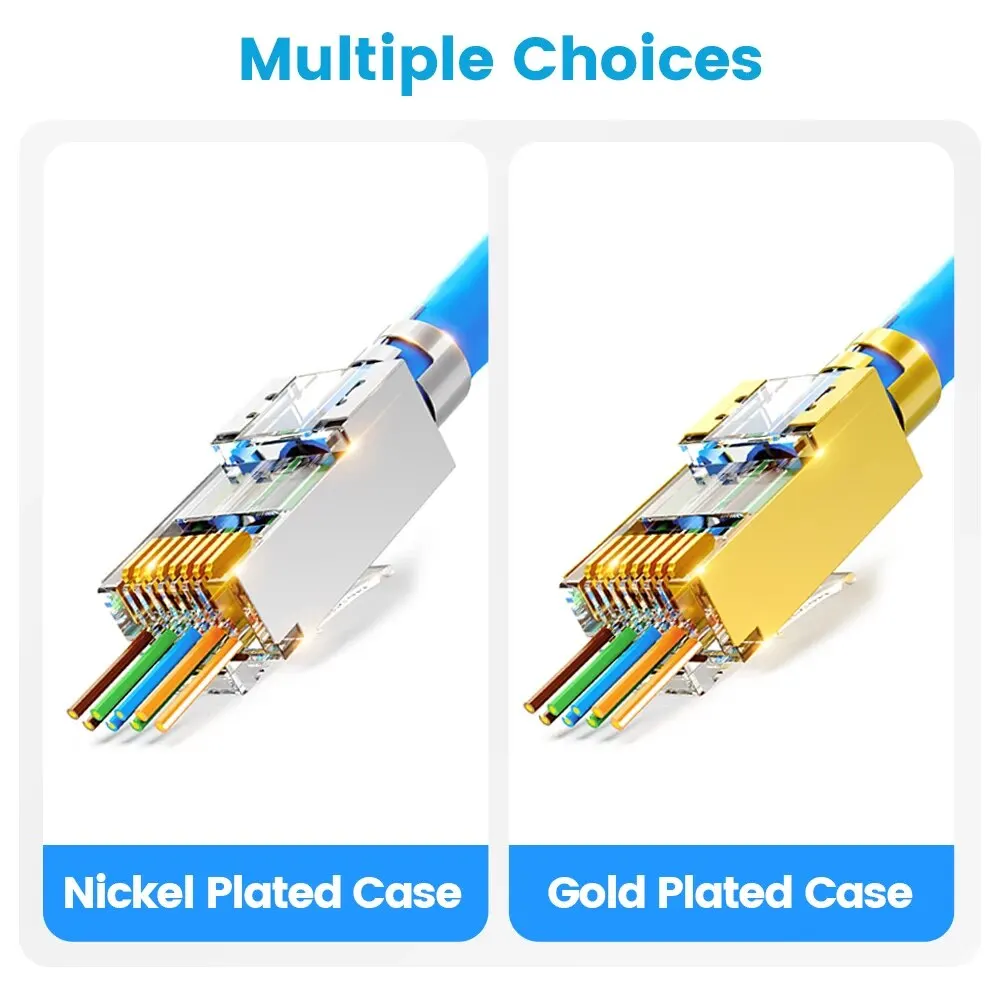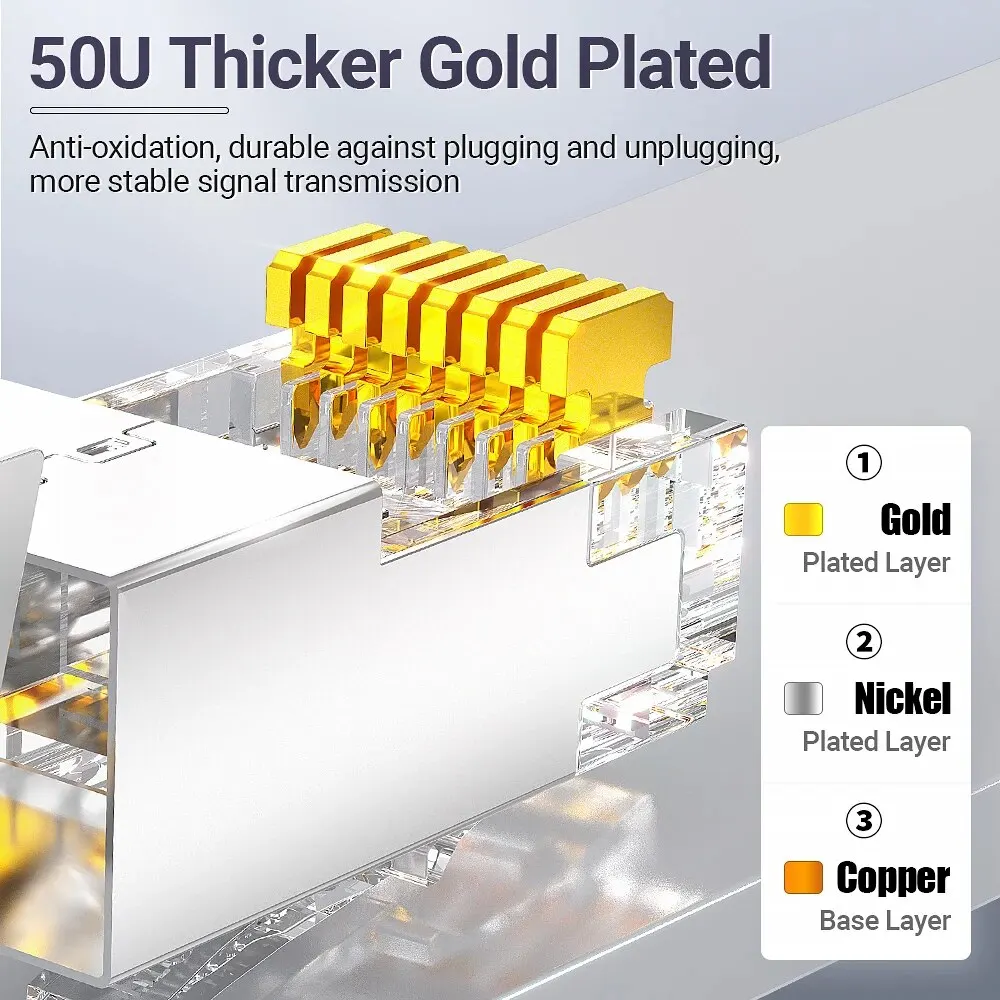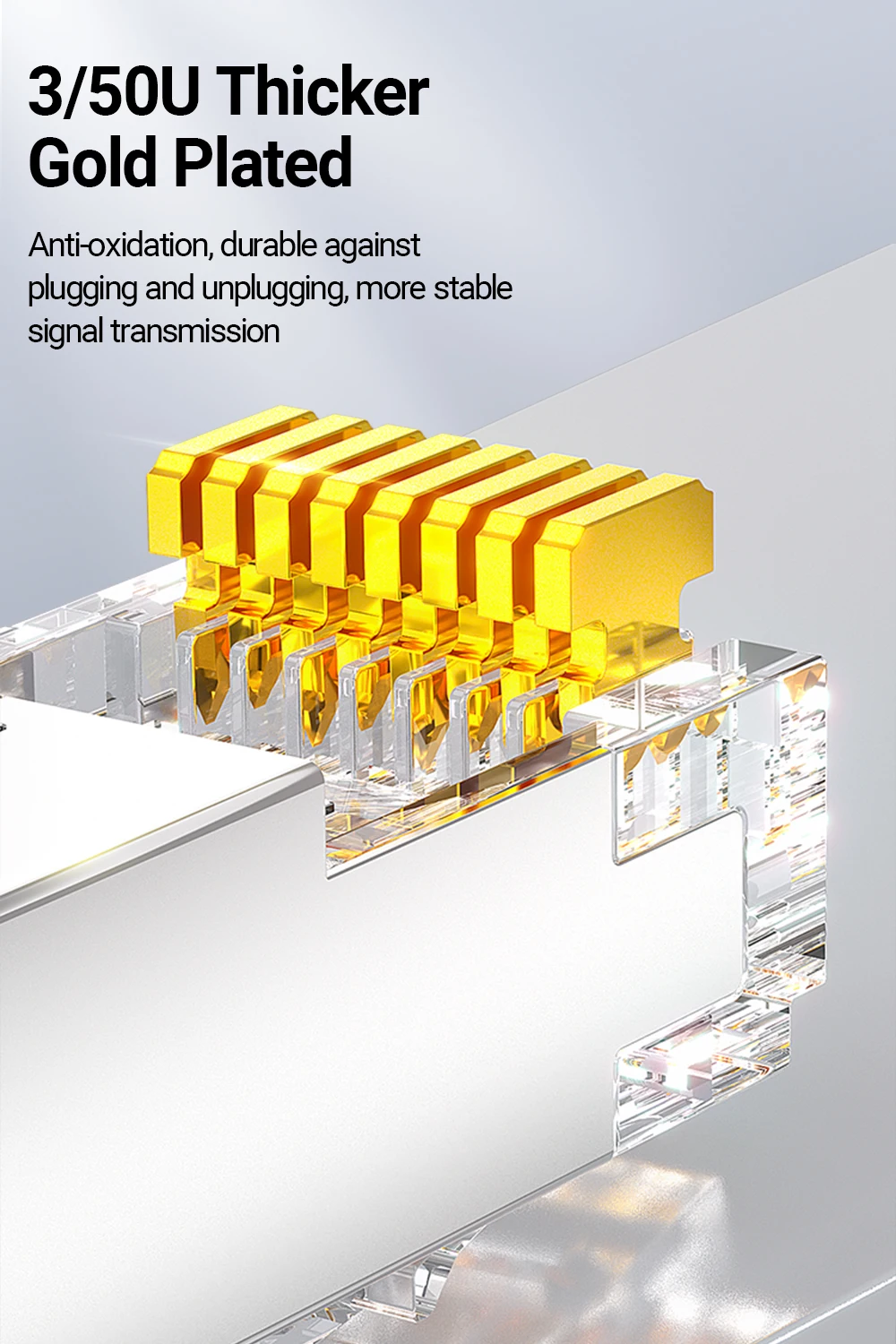 50 Micron Gold Plated Contacts provides a fully contact with wire conductor and ensure excellent conductivity ,Maintaining a Superior and Reliable Data Transmission,supporting up to 10 Gigabit transmission speed.