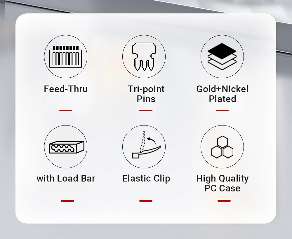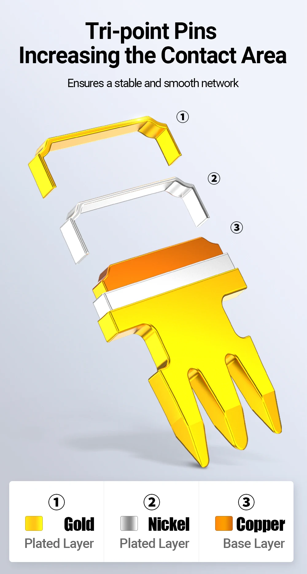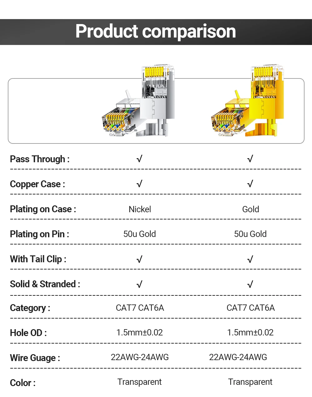 50 Micron Gold Plated Contacts provides a fully contact with wire conductor and ensure excellent conductivity ,Maintaining a Superior and Reliable Data Transmission,supporting up to 10 Gigabit transmission speed.