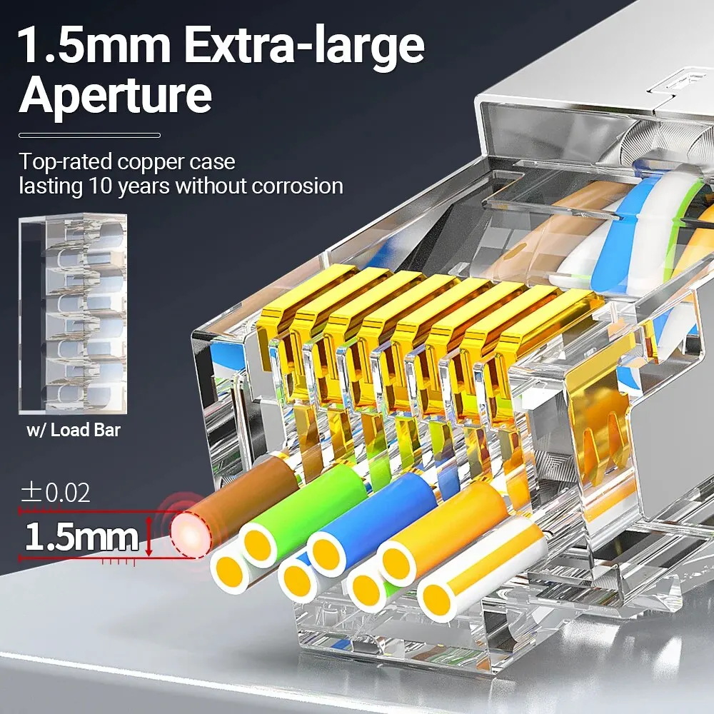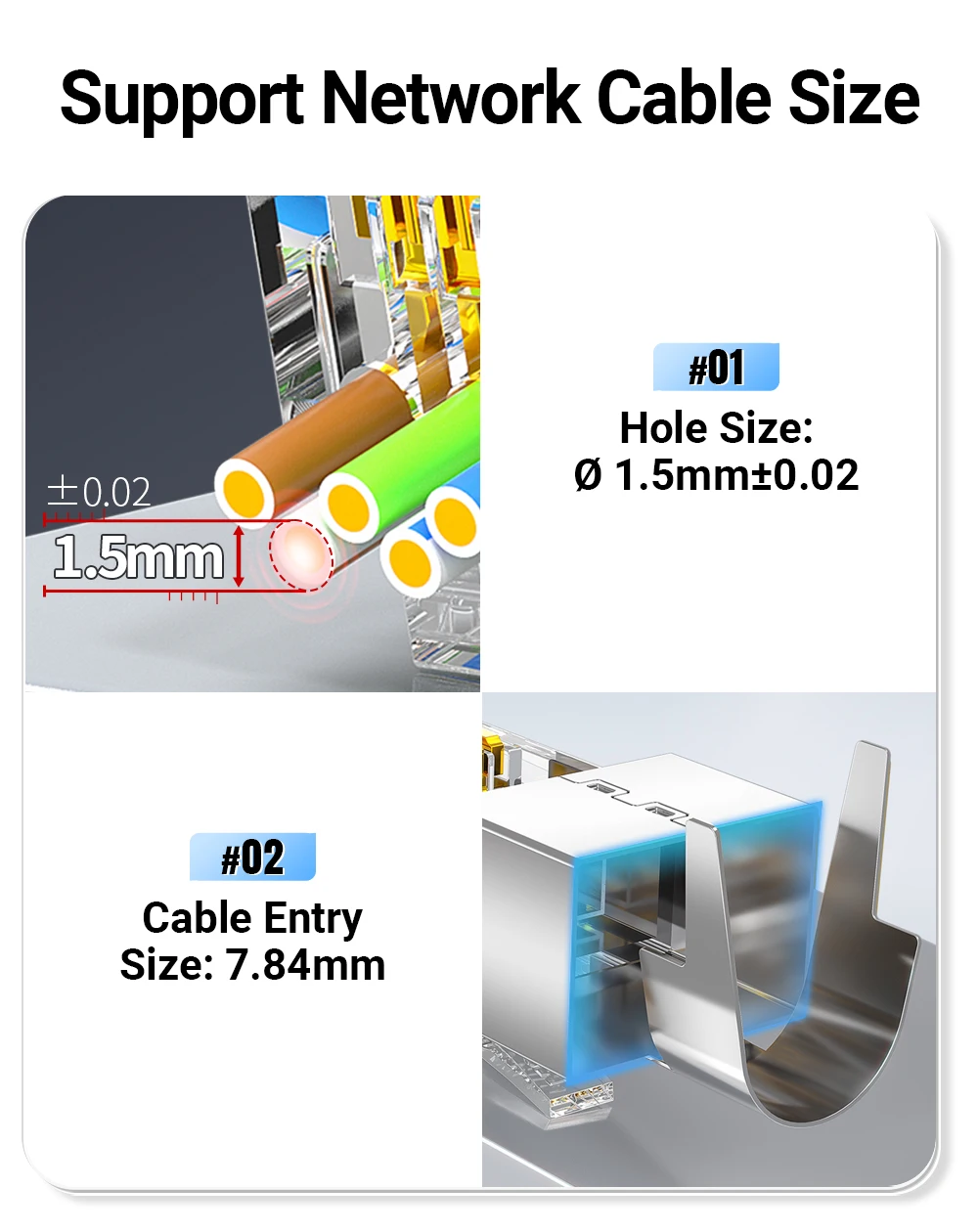 ✅These RJ45 modular connectors are designed to work specifically with CAT6A and CAT7 cables.Max conductor hole is ⌀1.5MM, supporting individual twisted pair conductor wire sizes up to 1.3mm~1.45mm.