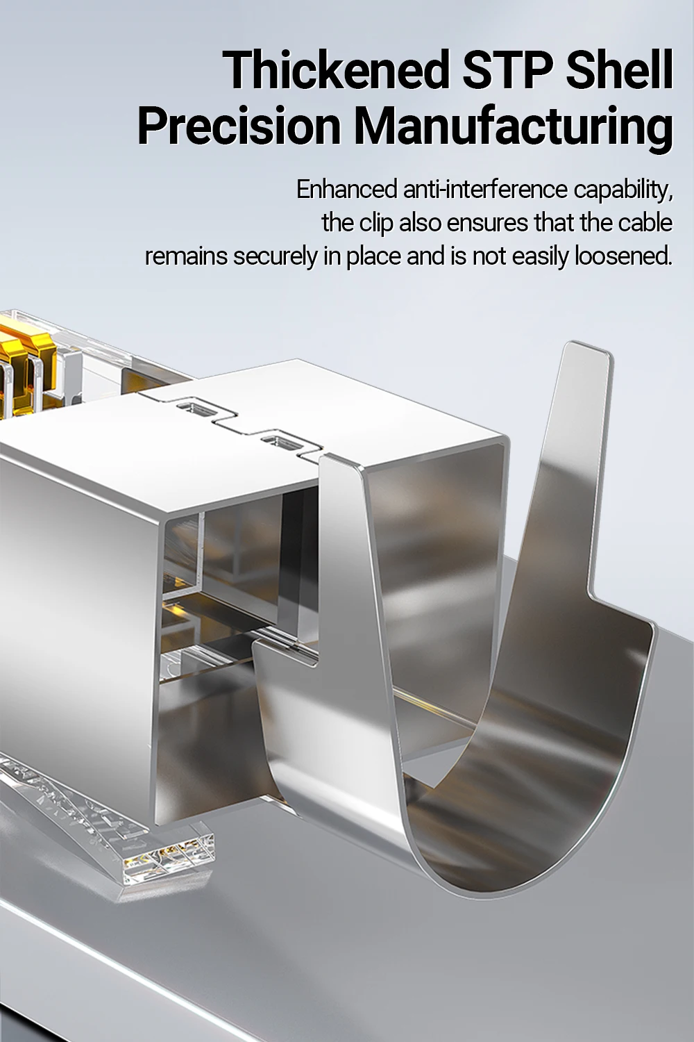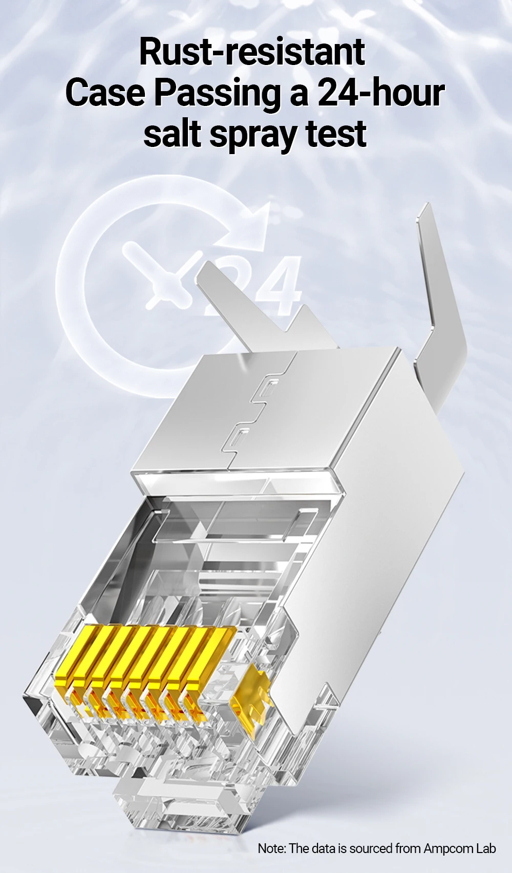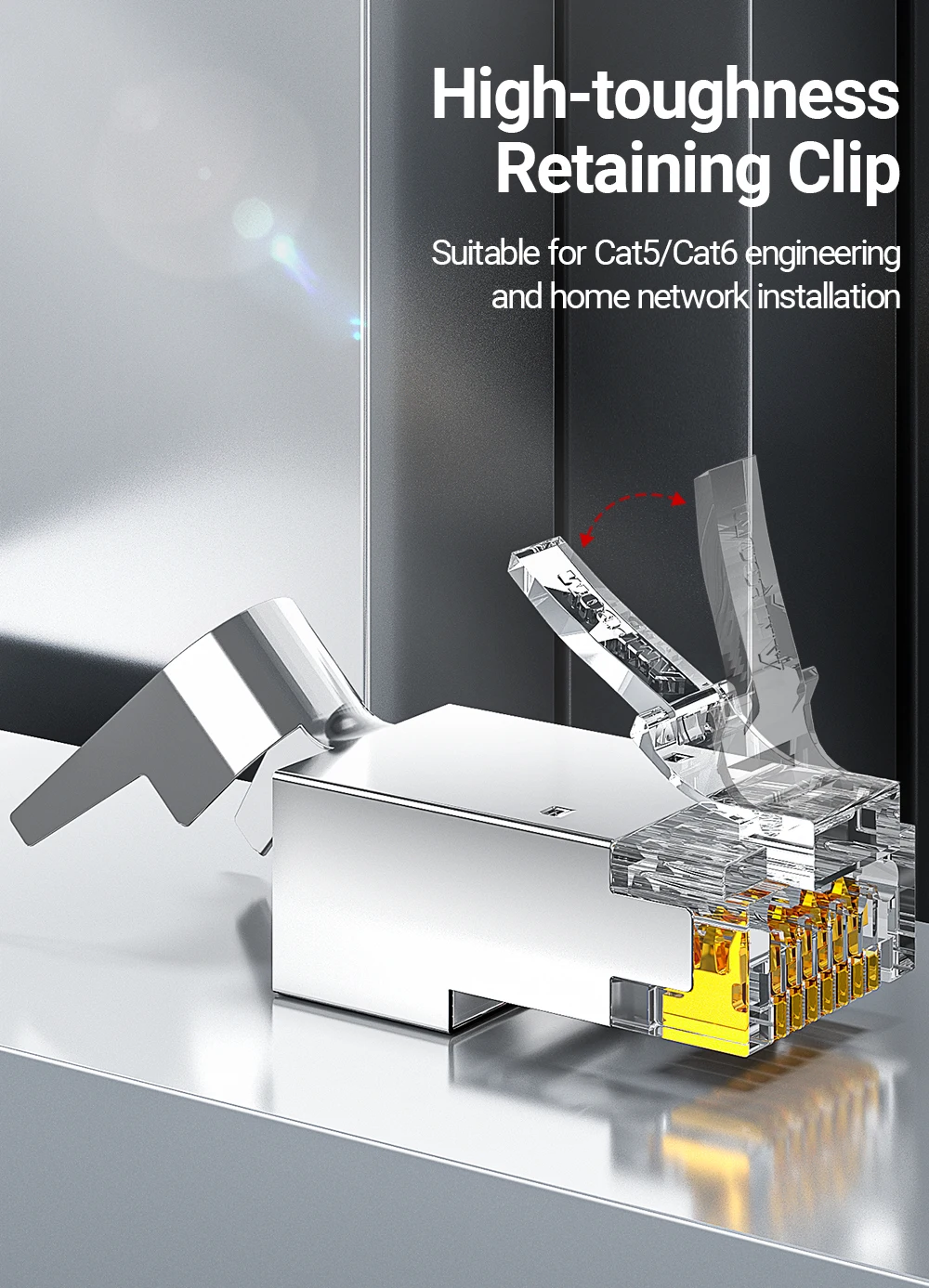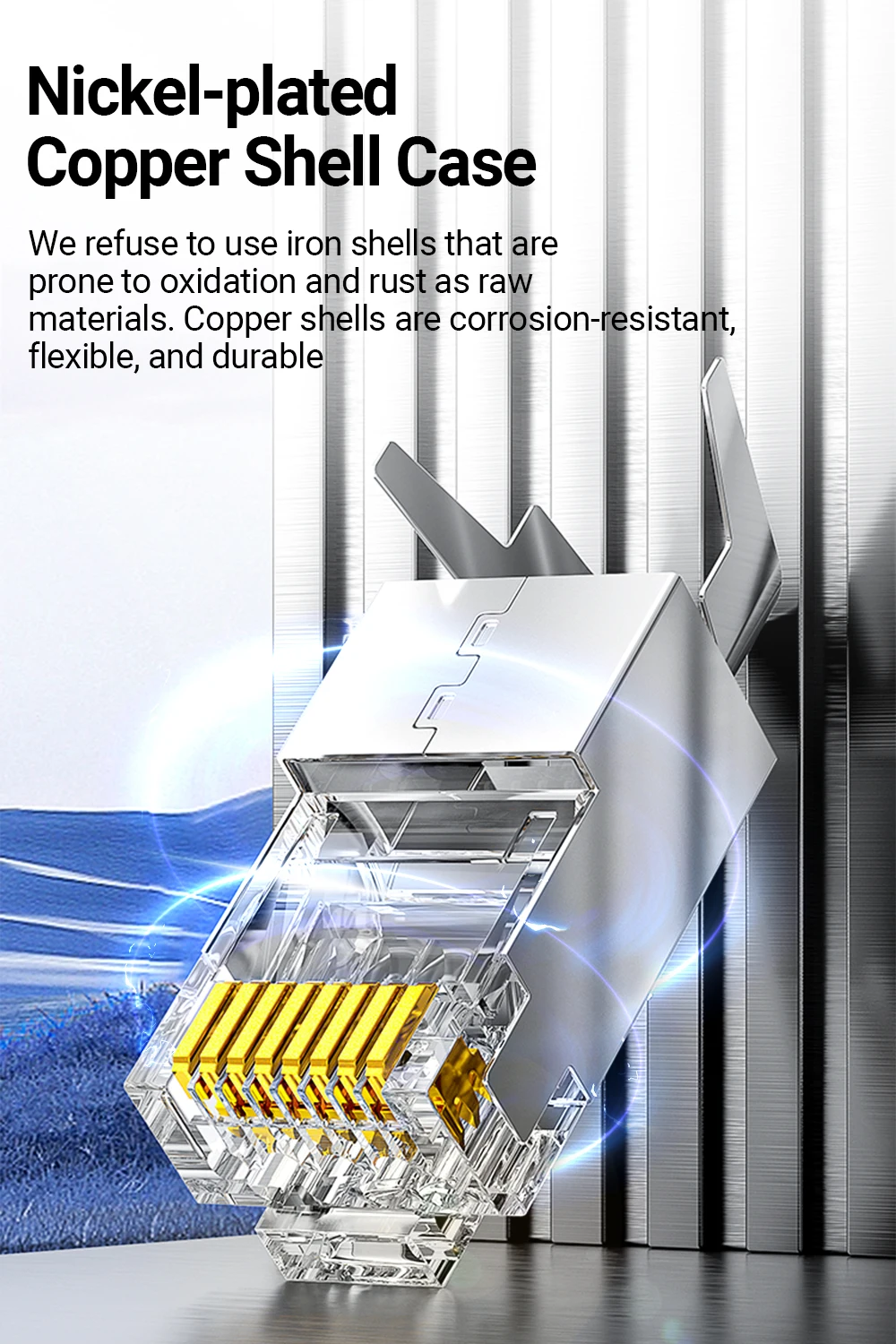 Perfect Shielded Shell-The shell of the connector is made of anti-interference pure copper material, and the surface is completely nickel-plated, which perfectly protects your network from signal loss and electromagnetic interference. In addition, swallowtail clip design can facilitate the connection of the ground wire, ensure high stability of network transmission, and maximize the opening of the shielding function.