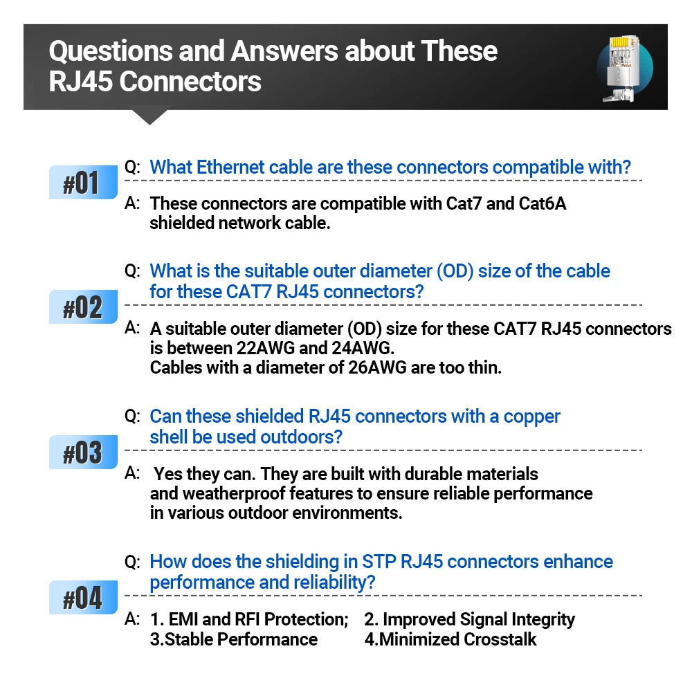 A: These connectors are compatible with Cat7 and Cat6A shielded network cable.